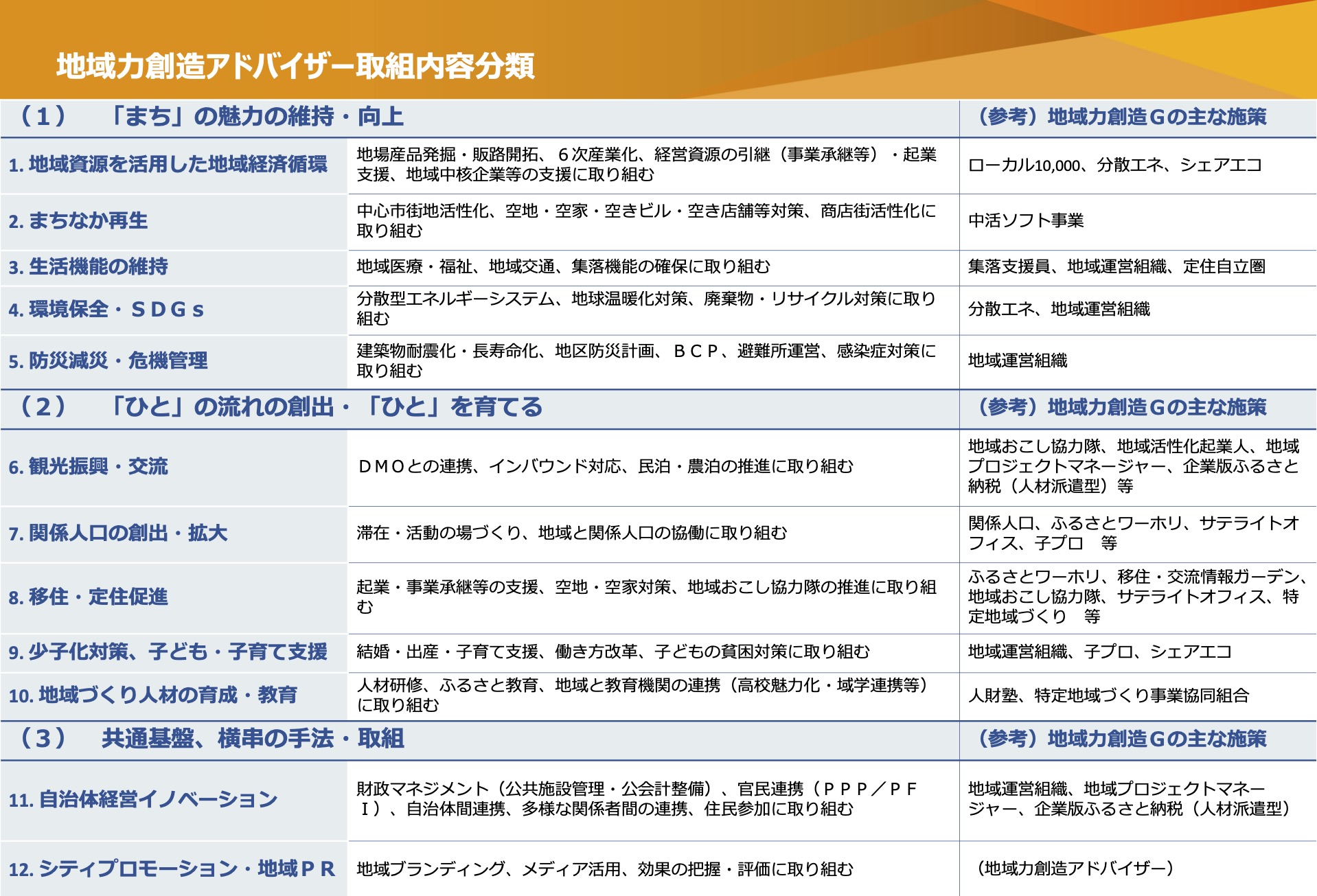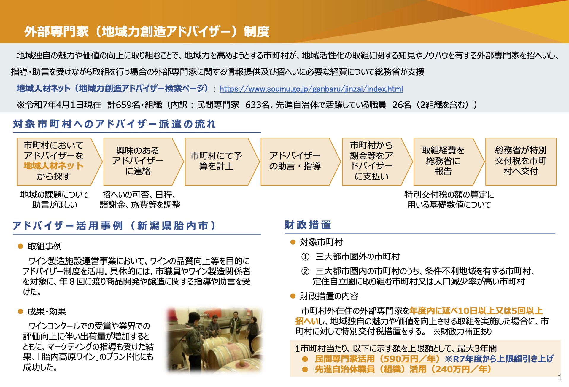 総務省では、地域づくりをするために、先進市町村で活躍している職員や民間専門家を招聘し活用することができる制度を運営している。同省のホームページには「地域人材ネット(地域力創造アドバイザー)」という項目があり、「市町村が、地域力創造のための外部専門家(地域人材ネット)」登録者、通称「地域力創造アドバイザー」)を招聘して、地域独自の魅力や価値を向上させる取り組みに要する費用を特別交付税措置の算定対象としています」とある。