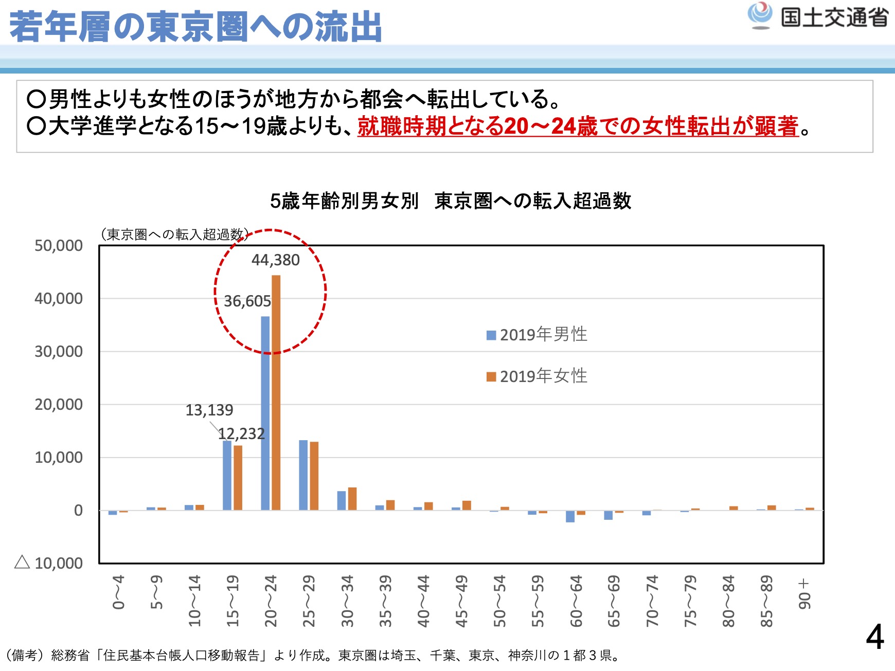 「地方における女性活躍」(国土交通省)という資料によれば、20から24才の就職時期の女性の都市部への転出が顕著だという。