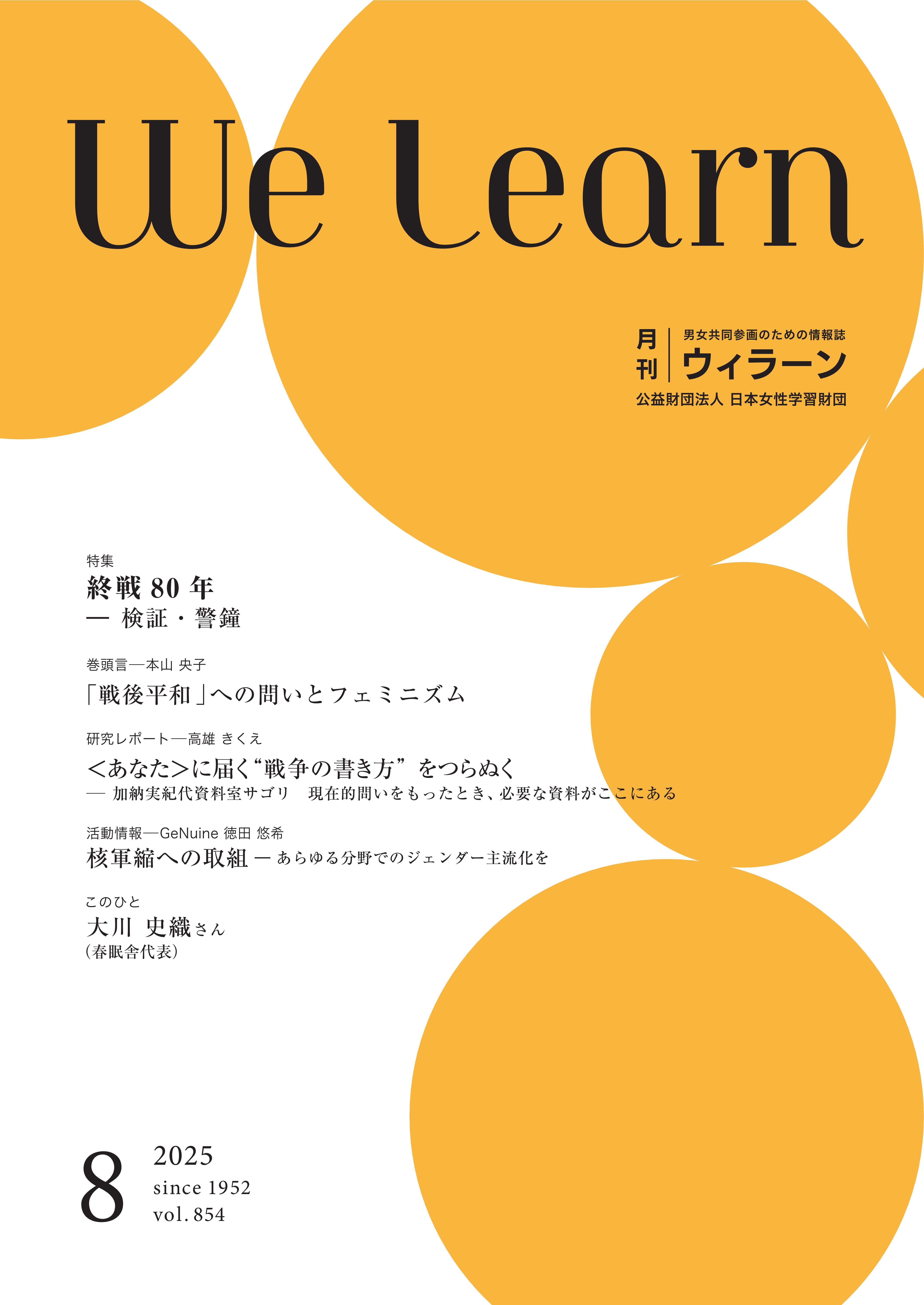 …………終戦80年を迎えるいま、社会をジェンダー視点で検証し、今後に向けて警鐘を鳴らす号にできたらと今号を企画しました。本山さん(巻頭言)の「日本の「戦後」はどのようにして「戦前」を準備するものとなってしまったのか」との問いかけを重く受け止め、高雄さん(研究レポート)の「さまざまな「なぜ」を共有することの重要さ」に私ができることを考えます。歴史に学び、警鐘の声に耳を傾け語り合う、その行為の積み重ねを大事にしたいと思いました…………