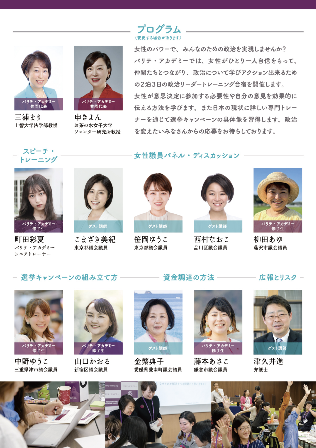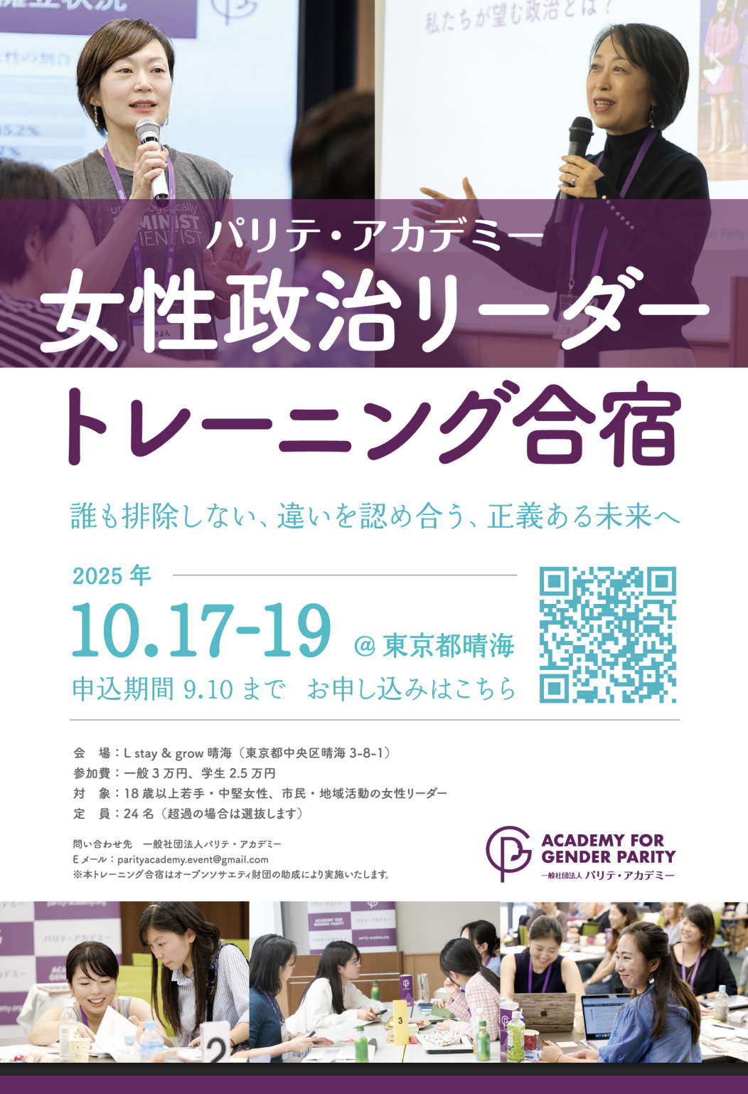 パリテ・アカデミーでは、女性が自信を持ち、仲間とつながり、政治について学び、行動につなげるための2泊3日の政治リーダートレーニング合宿を開催します。