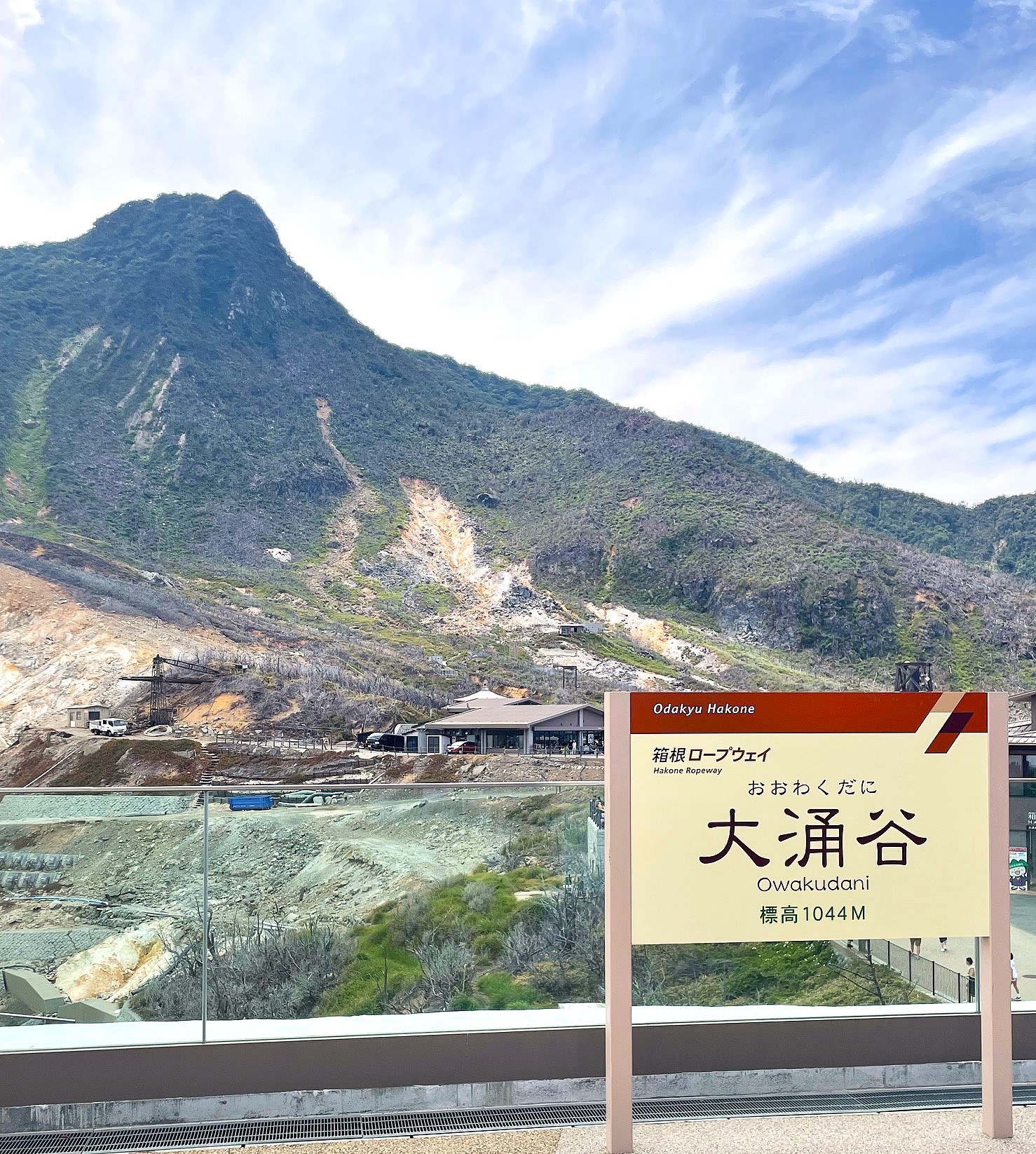 40万年前から続く火山活動の跡が地表に現れ、硫黄のにおいも漂ってくる。つい最近しつらえられたガラス張りの新スポット「ちきゅうの谷」から見える谷底の「地獄」の湯煙が昇ってくる。「くろたまご」像の向こうには雲に隠れた富士山が少し姿を見せていた。