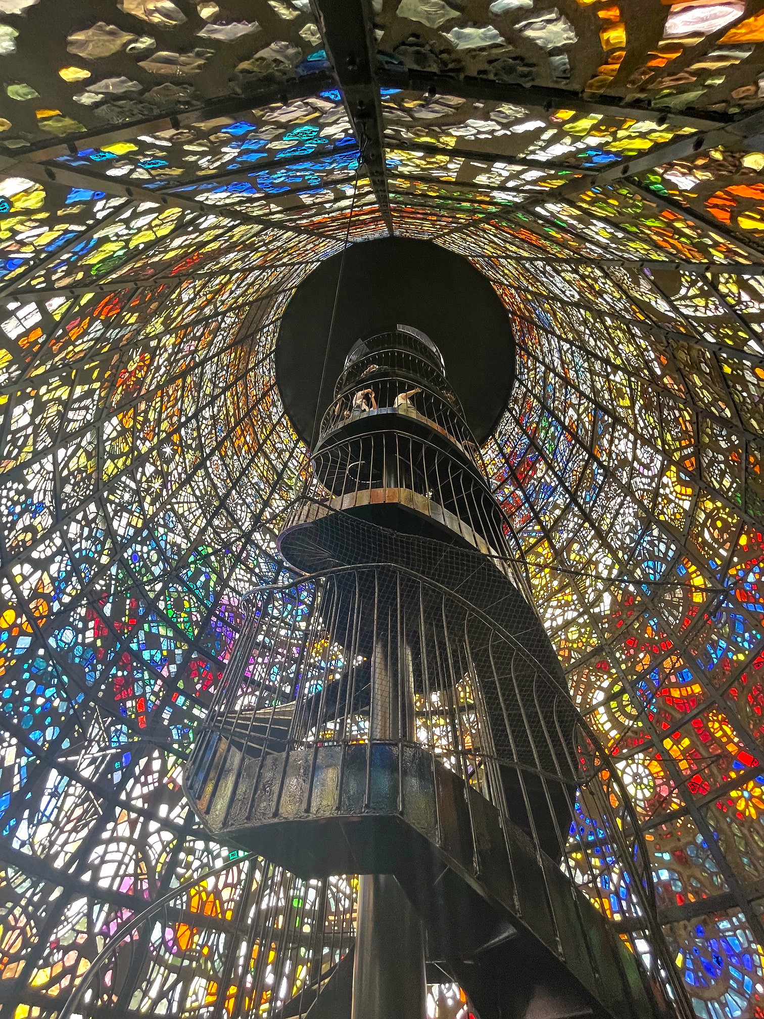 まずは「彫刻の森美術館」へ。1969年に開いた日本初の野外美術館。緑豊かな庭園に近・現代の彫刻家の作品が120点もあるとか。「幸せをよぶシンフォニー彫刻」(ガブリエル・ロワール)のステンドグラス製の丸い塔の螺旋階段を登ると、高さ18mの展望台から360度、全景が見渡せる。体を吹き抜ける爽やかな風が気持ちいい。