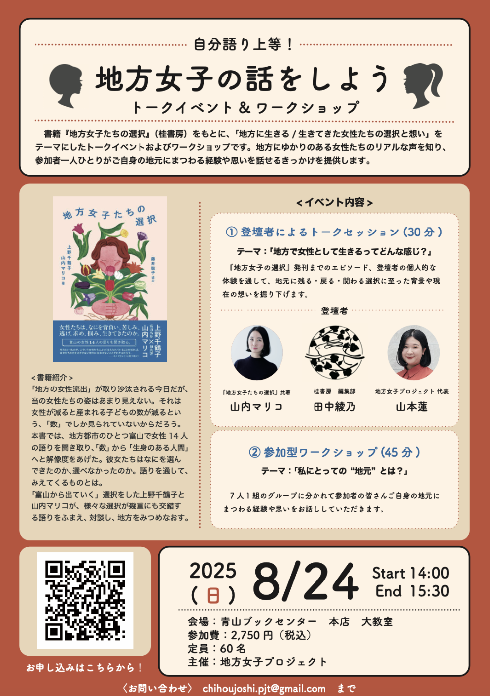 書籍『地方女子たちの選択』(桂書房)をもとに、「地方に生きる/生きてきた女性たちの選択と想い」をテーマにしたトークイベントおよびワークショップです。地方にゆかりのある女性たちのリアルな声を知り、参加者一人ひとりがご自身の地元にまつわる経験や思いを話せるきっかけを提供します。