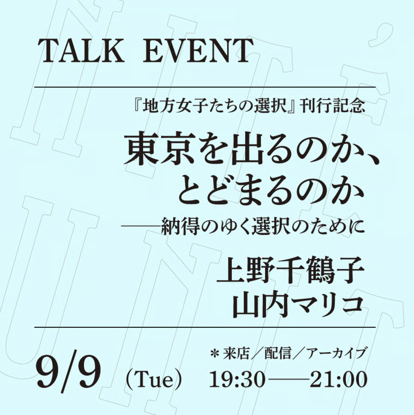 本と珈琲の店 UNITÉは、『地方女子たちの選択』(桂書房)の執筆者である社会学者の上野千鶴子さん、小説家の山内マリコさんをお招きし、「東京を出るのか、とどまるのか──納得のゆく選択のために」というテーマでお話しいただきます。お二人の対談は同書にも採録されていますが、こちらは富山開催。東京・三鷹にある当店での対談は、どのような展開になるでしょうか。