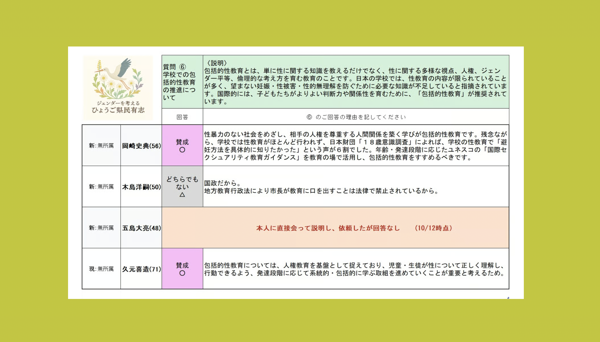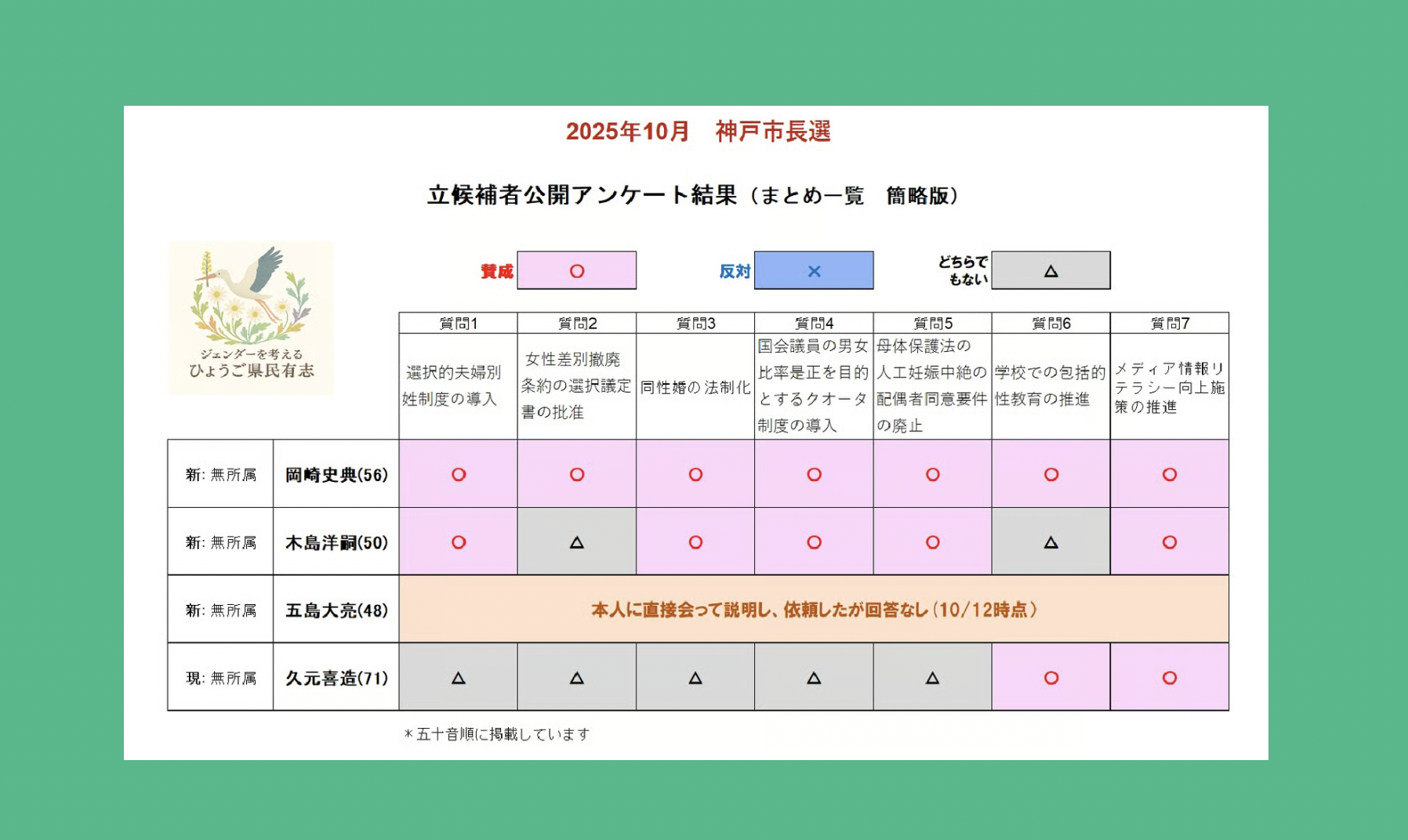 神戸市長選ジェンダー政策アンケートまとめ一覧