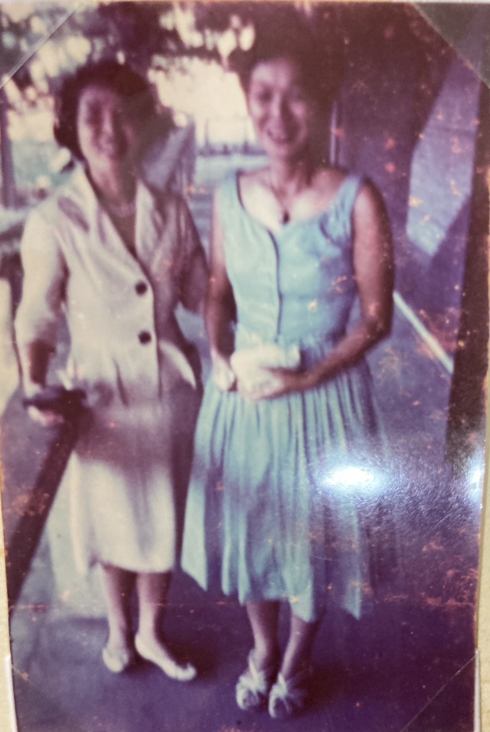 もうお一人、お訪ねした人の中で忘れられない方がいらっしゃる。母のアルバムに「茅ケ崎中海岸にて」とある2枚の写真で、アメリカのシカゴ大学のチェニー先生とAさん、ほとんど同じ位置でチェニー先生と母の2枚のツーショットがあるが、来日したチェニー先生の通訳をなさったSさんである。母より少し年上の、英語がご堪能な素敵な女性で、母と一緒にふたりで写った写真がある。母は白っぽい、7分袖のオーソドックスな襟付きスーツ姿で、その隣に、ライトブルーのノースリーブの首元の大きく開いたおしゃれなワンピース姿で、大きめのペンダントをつけていらっしゃるのがSさん。ピントはぼけているが、二人とも白い歯を見せて笑っているいい写真だ。