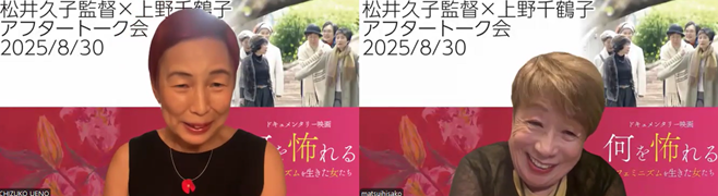 14人の女性の葛藤と歩みを記録した『何を怖れる』をオンラインで事前上映し、その視聴者とともに、松井久子監督と上野千鶴子さんによるトークを通じて、フェミニズムの歴史と現在を振り返るという企画です。
