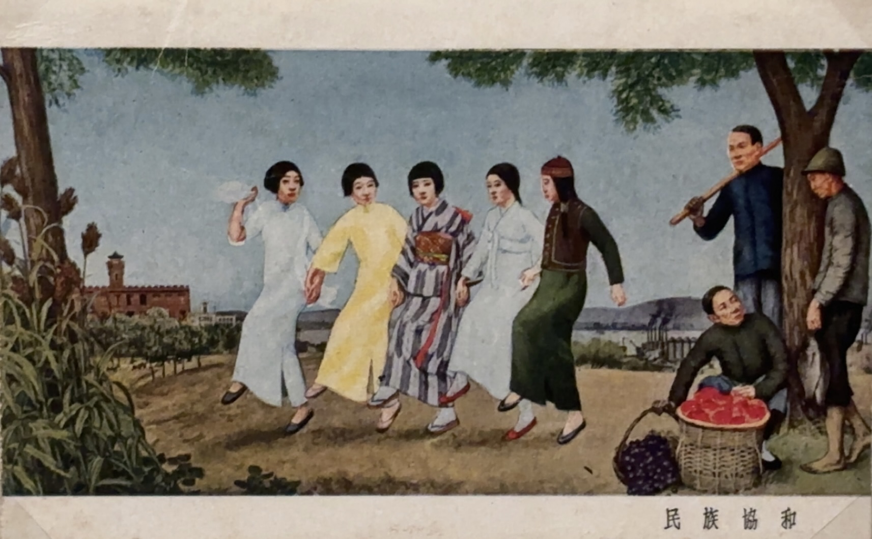 私が本展において最も恐ろしい作品だと思ったものは、戦闘図としての戦争画ではない。今は原画が失われてしまった1枚の絵葉書である。洋画家の大家岡田三郎助による《民族協和》(本展のウェブサイトにも掲載されている。)は、満州国国務院総務庁玄関壁画として制作された。着物を着た日本の少女を真ん中に両脇に、漢、満、朝、蒙の民族衣装を着た少女たちが手をつないで楽しげに踊る。右脇には漁業、農業、牧畜業を表わす柔和なアジア人男性らが控えている。一見何でもない牧歌的な絵だが、「大東亜共栄圏」の力関係がそこに仮託されている。アジアの少女たちを従えた日本の少女と近代性をはぎ取られた力のないアジア男性の存在が、日本の優位性を視覚的に示している。ここに日本人男性たちはいない。なぜなら彼らはこの光景をまなざす目に他ならないからである。遠景に広がる近代的な工場や建物は、日本のおかげで建設されたことも暗示している。これが公的建築物に掲げられ、絵葉書となって社会に流布し、そのまなざしは正当化されて、植民地主義を日本人の心のうちに知らない間に根付かせていく。