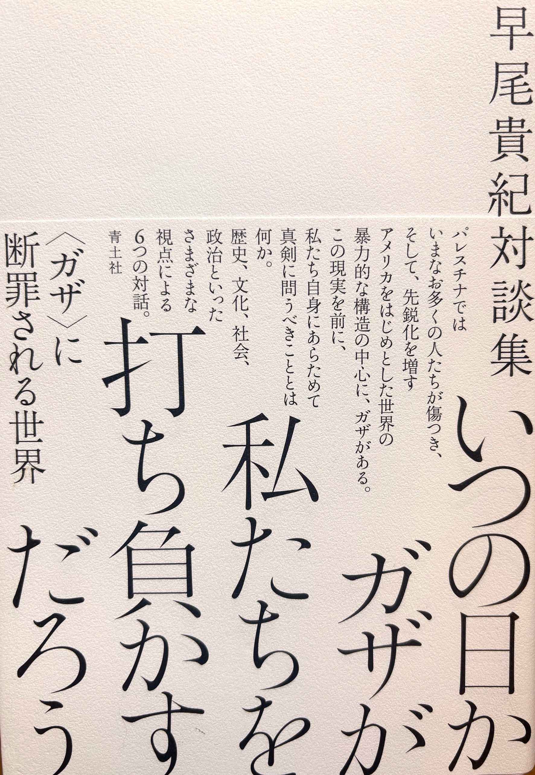 早尾さんの熱のこもったお話に、会場の人々とともに共感しながら拝聴する。だけど、「なんて私は、これまで何も知らなかったのだろう」と思って心から恥じた。遠い地のこととはいえ、かの地の歴史も現在も、あまりにも知らなさ過ぎたのではないか、と。マスコミ報道も決して真実を伝えてはいない。さらに日本の過去と現在も、この地のジェノサイドとかかわりがあることに少しも気づかなかったとは。ああ、恥ずかしい。だから早尾さんの対談集『いつの日かガザが私たちを打ち負かすだろう』を読んで、一つひとつ確認していくしかなかったのだ。