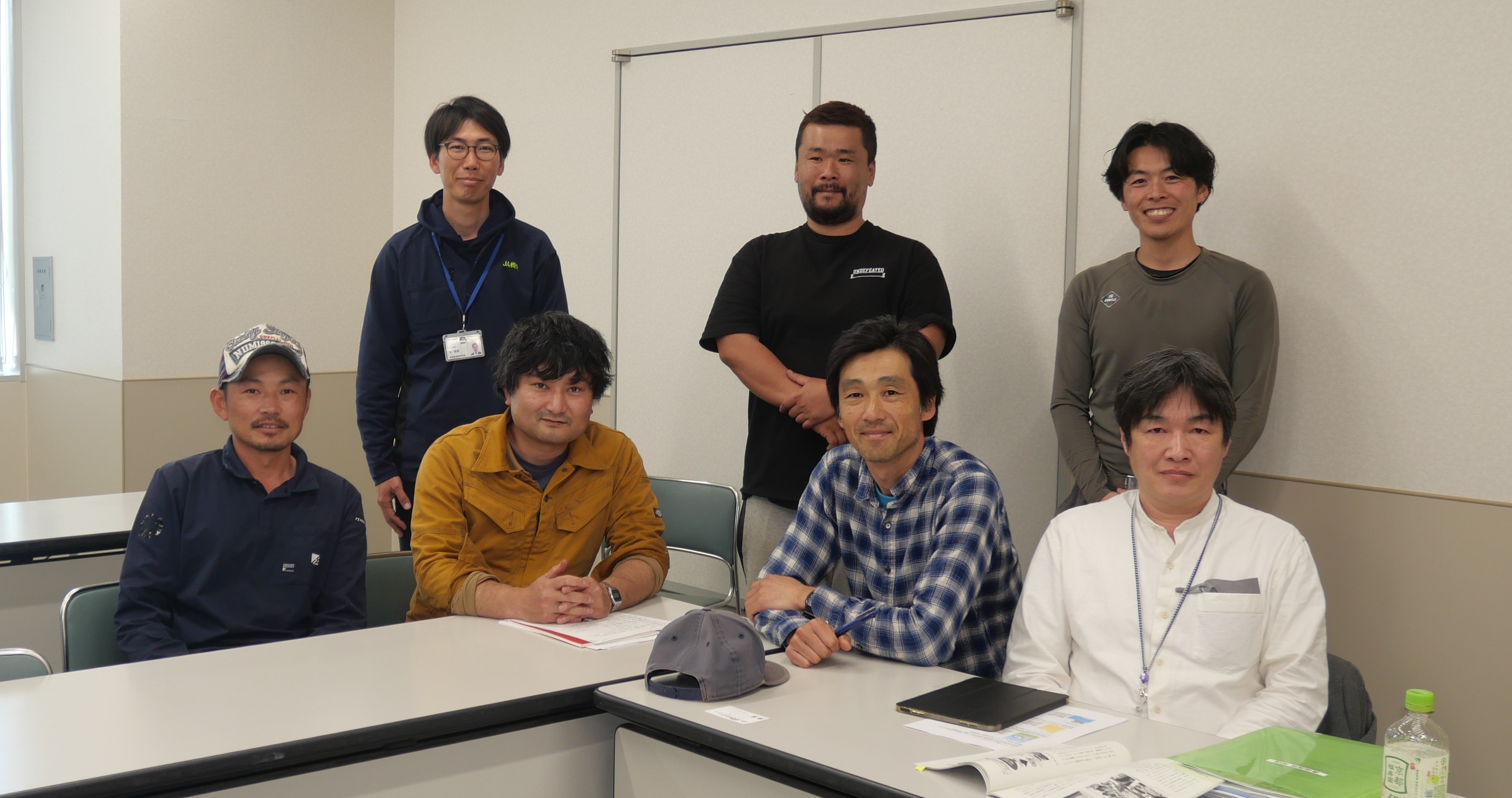農福連携の農家と関係者の人たち。手前左から田丸秀昭さん、角田隆一さん、角田泰信さん、社会福祉法人同愛会つづき地域活動ホームくさぶえ堀内哲也さん。後ろ、左からJA横浜・菅俊寿さん、農家の中山大介さん、長谷川裕章さん。