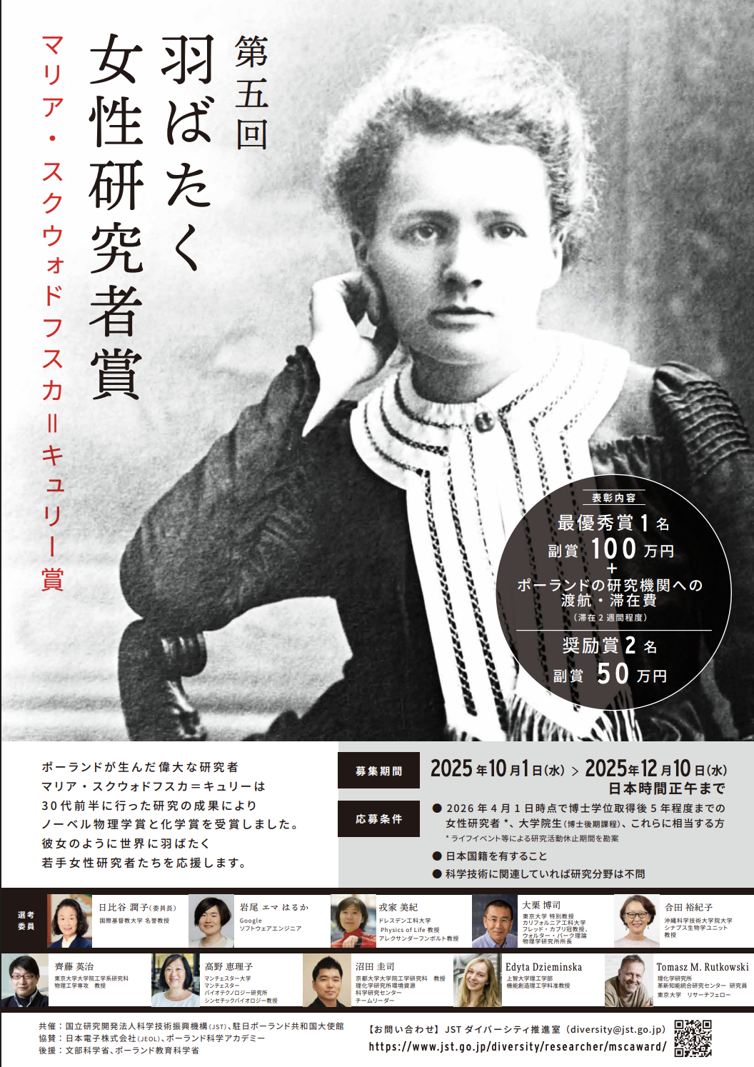 国立研究開発法人科学技術振興機構(JST)では、科学技術・イノベーションの創出に向けて女性研究者の活躍を推進しております。2021年度、駐日ポーランド共和国大使館とともに、国際的に活躍が期待される日本の若手女性研究者を表彰する「羽ばたく女性研究者賞(マリア・スクウォドフスカ=キュリー賞)」を創設しました。本賞は、ポーランドが生んだ偉大な女性研究者、マリア・スクウォドフスカ=キュリー注)が、30歳台前半での功績を認められノーベル賞を受賞したことにちなみ、その名を冠しています。