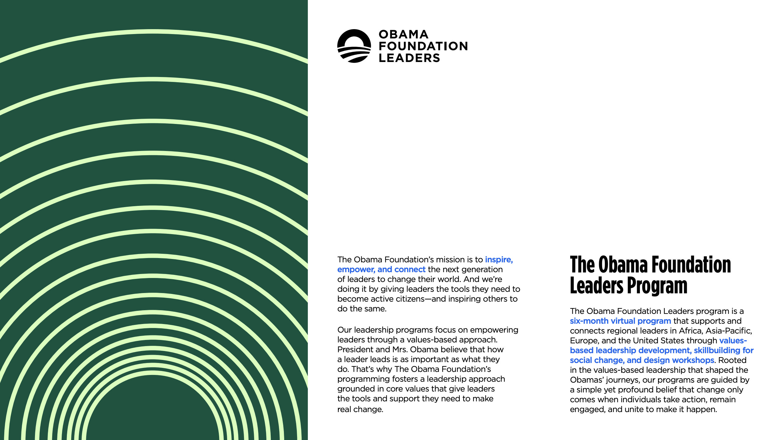 “The Obama Foundation Leaders Asia-Pacific program unites leaders from across Southeast Asia, Northeast Asia, and Oceania to engage in values-based leadership discussions, skillbuilding for social change, and hands-on workshops. To date, the program has built a network of 340 leaders, hailing from over 38 nations and territories, working across various sectors and issue areas.
