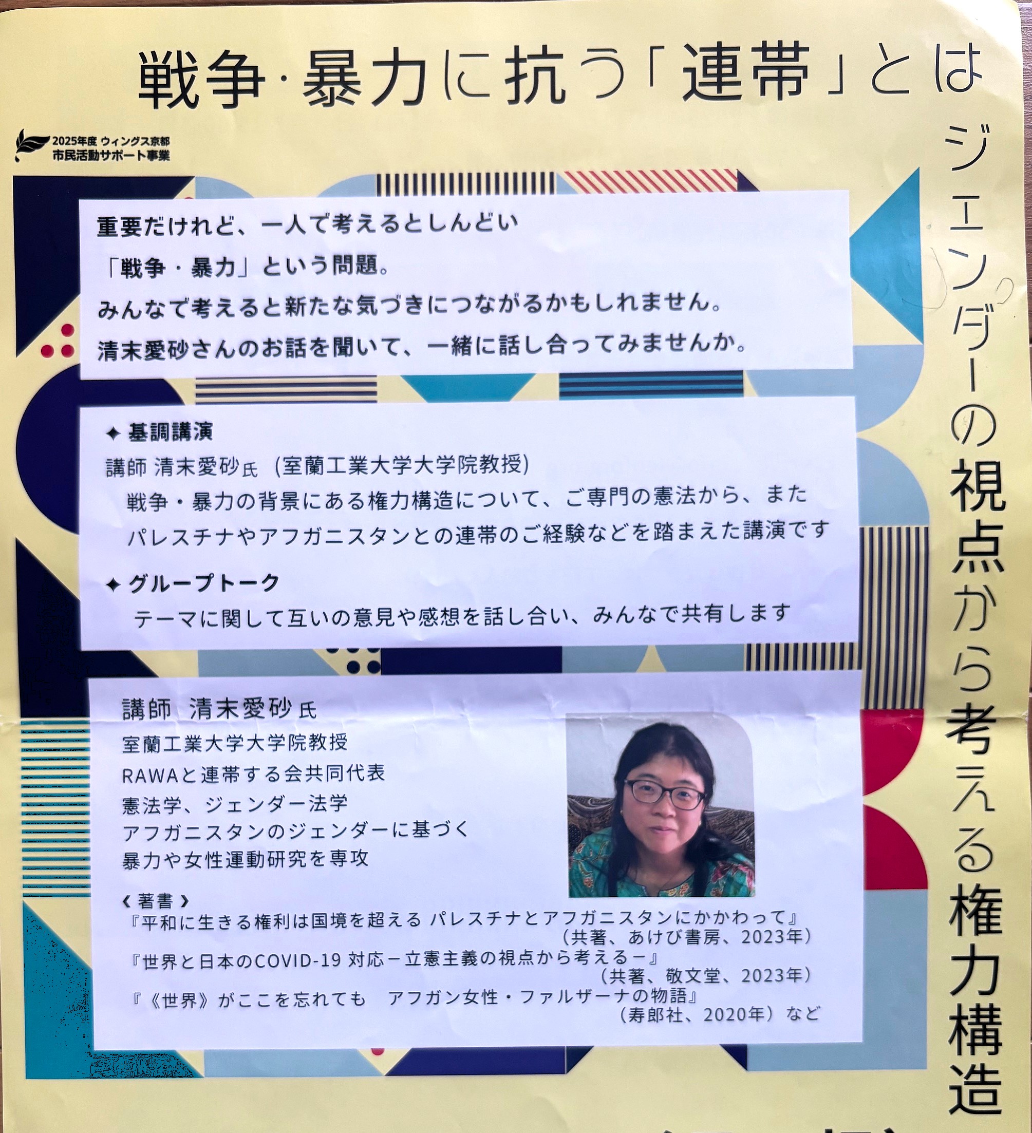 その清末さんが、2025年11月24日(月・祝)、京都に講演に来られると知り、早速、会場のウィングス京都へ向かう。テーマは「戦争・暴力に抗う「連帯」とは ジェンダーの視点から考える権力構造」(主催・一般社団法人LEO-G)。LEO-Gの堀久美さんに誘われて、「ふぇみん」の友人にも呼びかけて参加する。