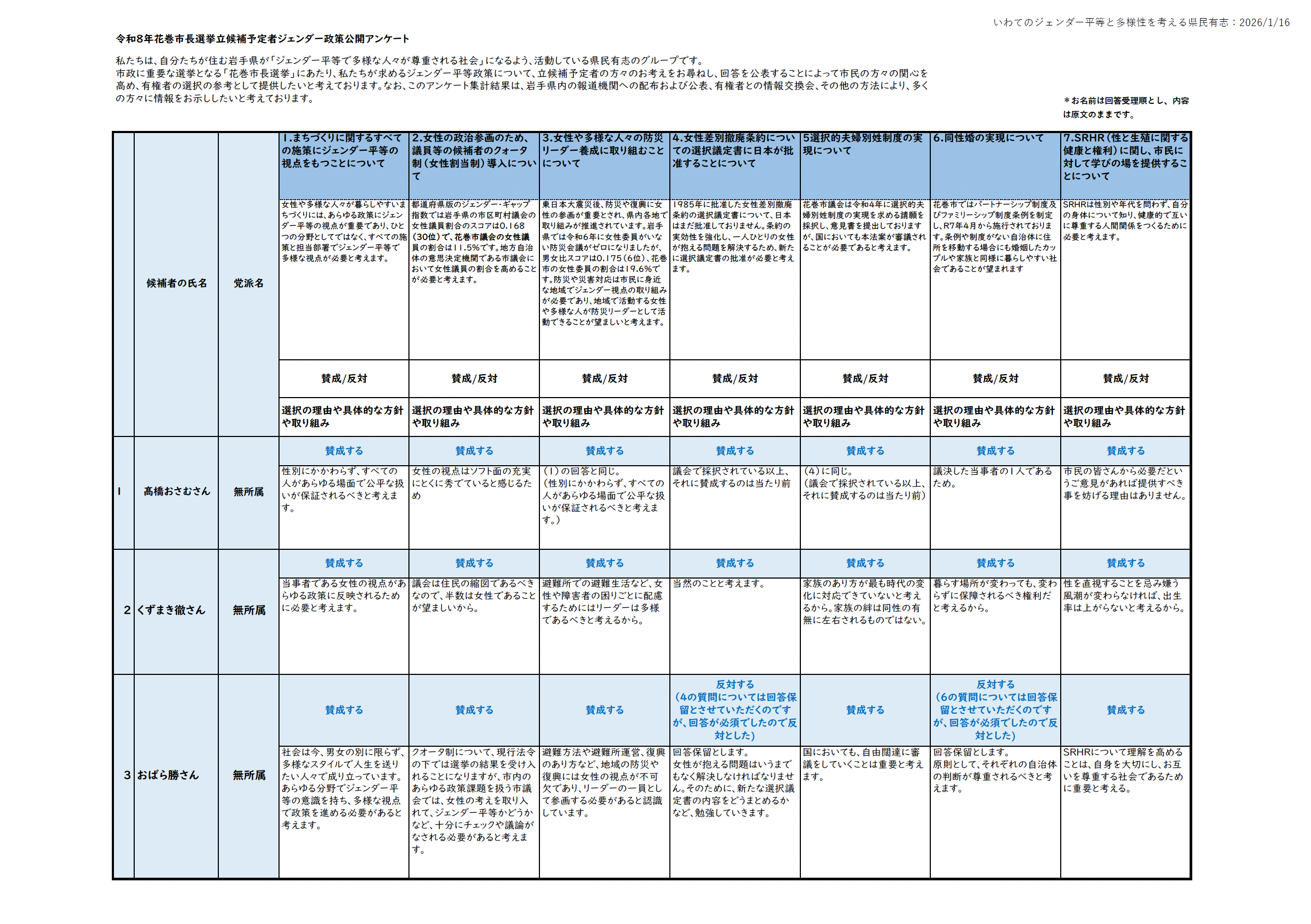 **令和8年花巻市長選挙立候補予定者ジェンダー平等政策公開アンケート**