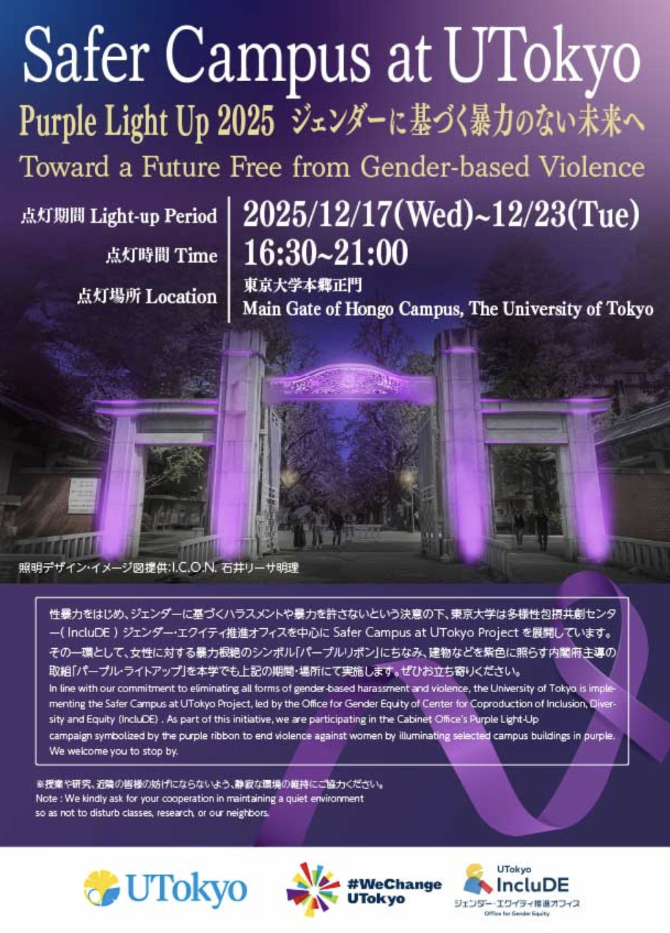 2025年は、東京大学の本郷キャンパス正門においてパープル・ライトアップを実施し、学内への周知をはじめ地域や社会に向けて、ジェンダー平等、暴力根絶、人権尊重のメッセージを発信しました。