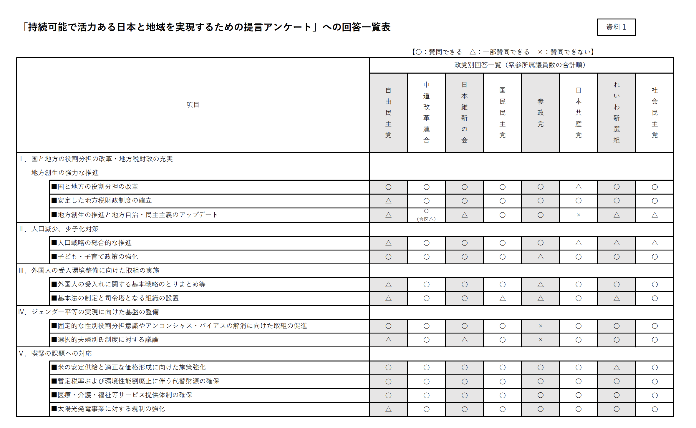 全国知事会では、衆議院解散を踏まえ、各政党に対して提言アンケートを提出し、回答を依頼し、各政党からの回答結果を令和8年1月26日公開しています。