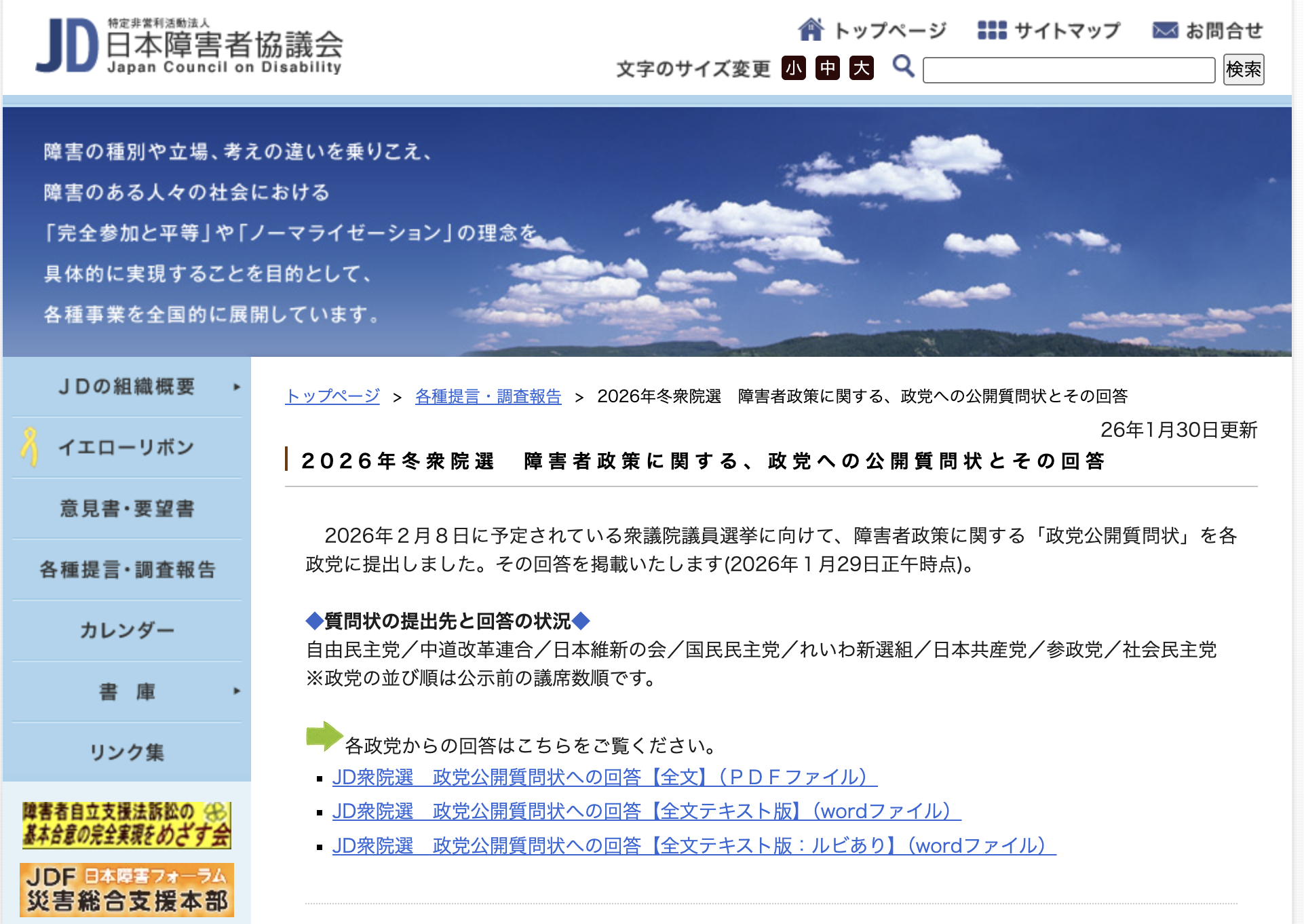 ◯2026年冬衆院選 障害者政策に関する、政党への公開質問状とその回答