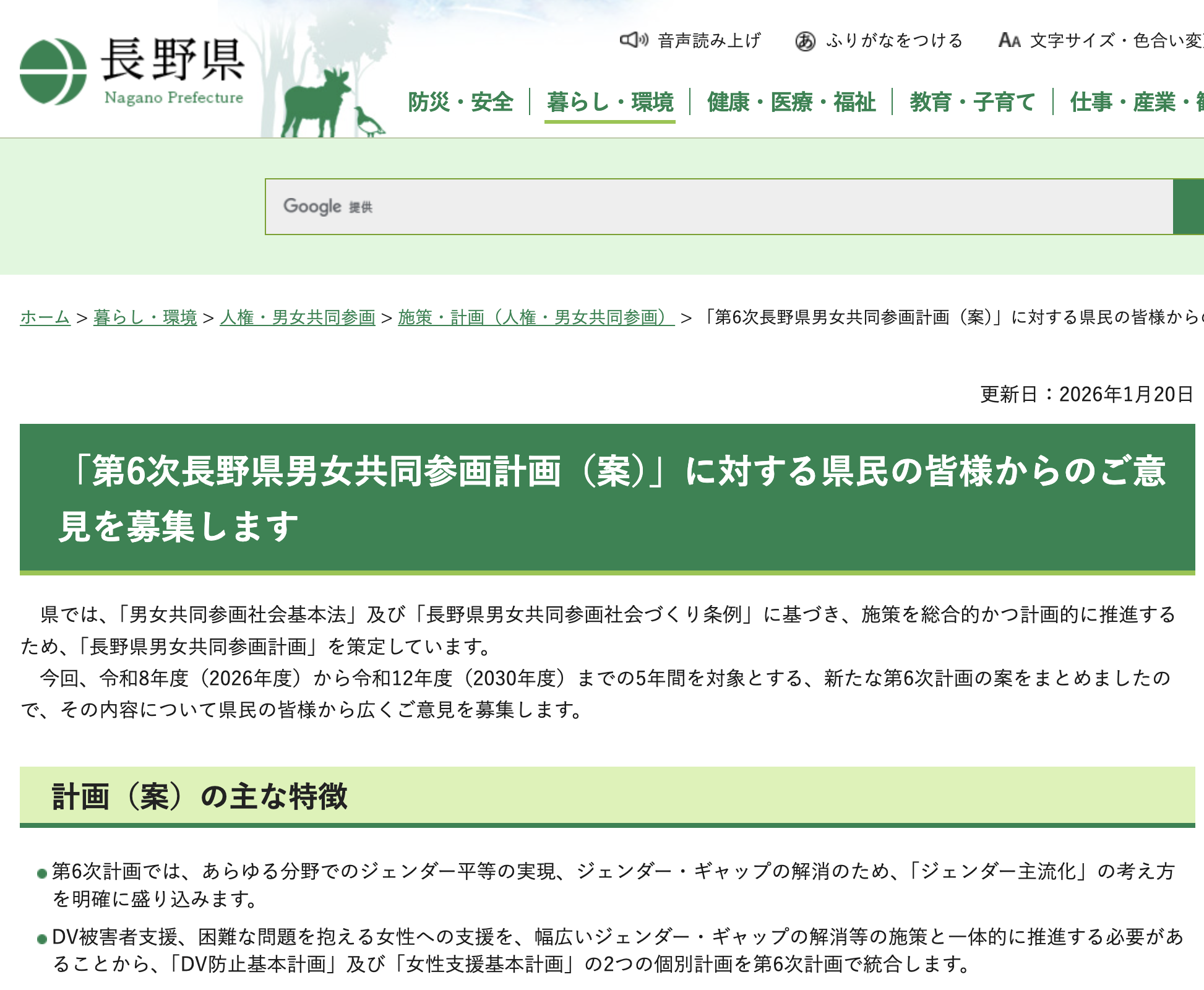 長野県男女共同参画審議会は昨年2025年12月に第六次男女共同参画計画案を答申しました。