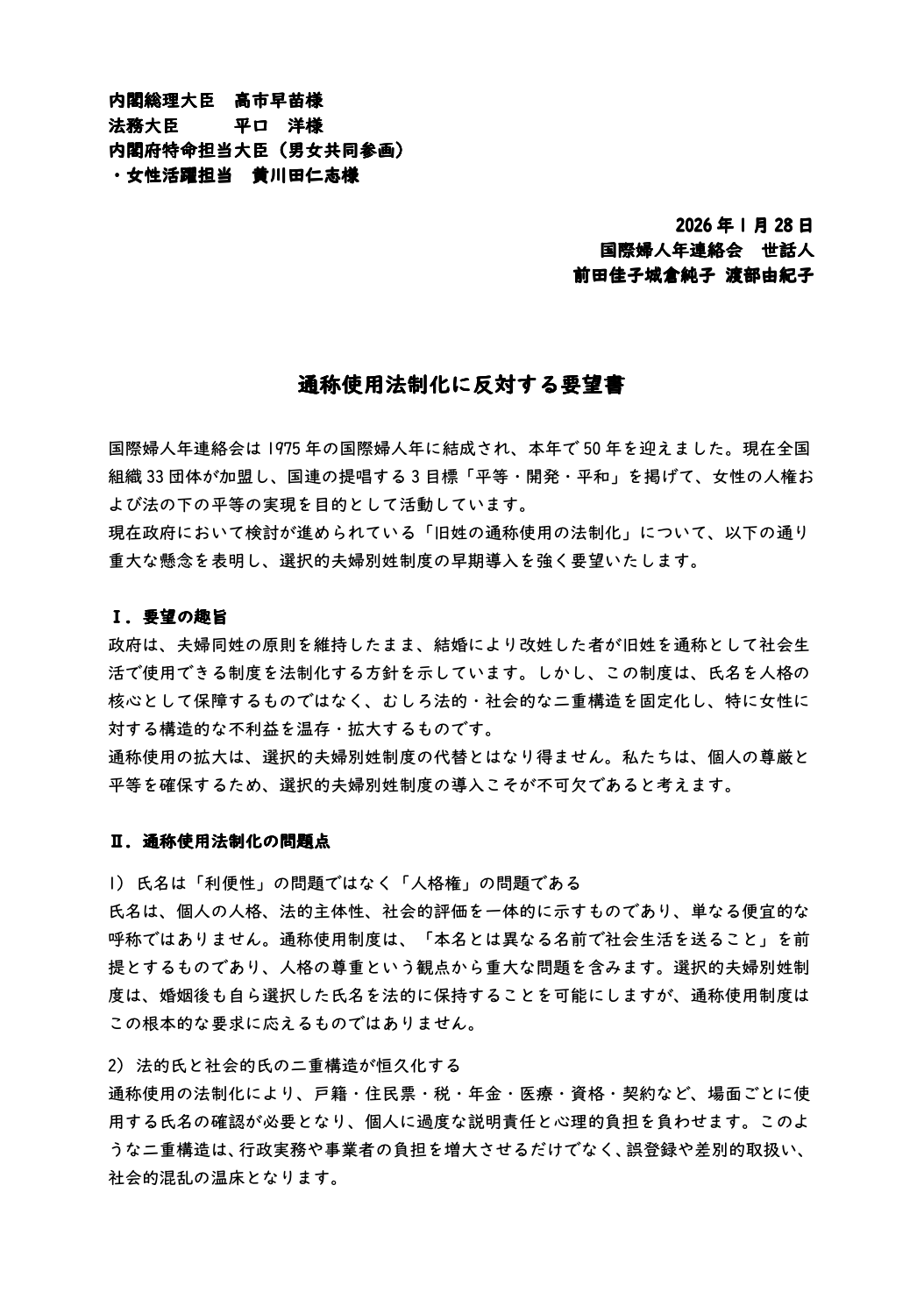 2026年1月28日、国際婦人年連絡会 https://iwylg-jp.com/ は内閣総理大臣・法務大臣・内閣府特命担当大臣(男女共同参画)・女性活躍担当に、通称使用の法制化に反対する要望書を提出しました。