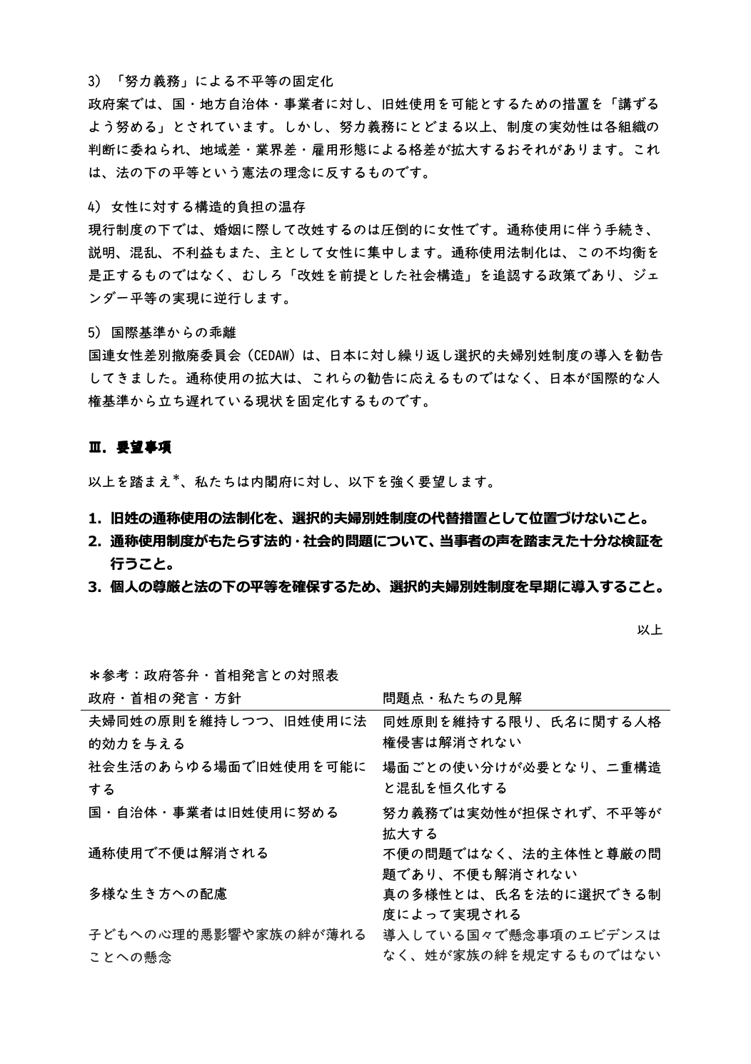 国際婦人年連絡会は33 団体が加盟し、国連の提唱する 3 目標「平等・開発・平和」を掲げて、女性の人権および法の下の平等の実現を目的として活動通称使用の法制化に反対し、選択的夫婦別姓制度の早期導入を強く要望いたします。