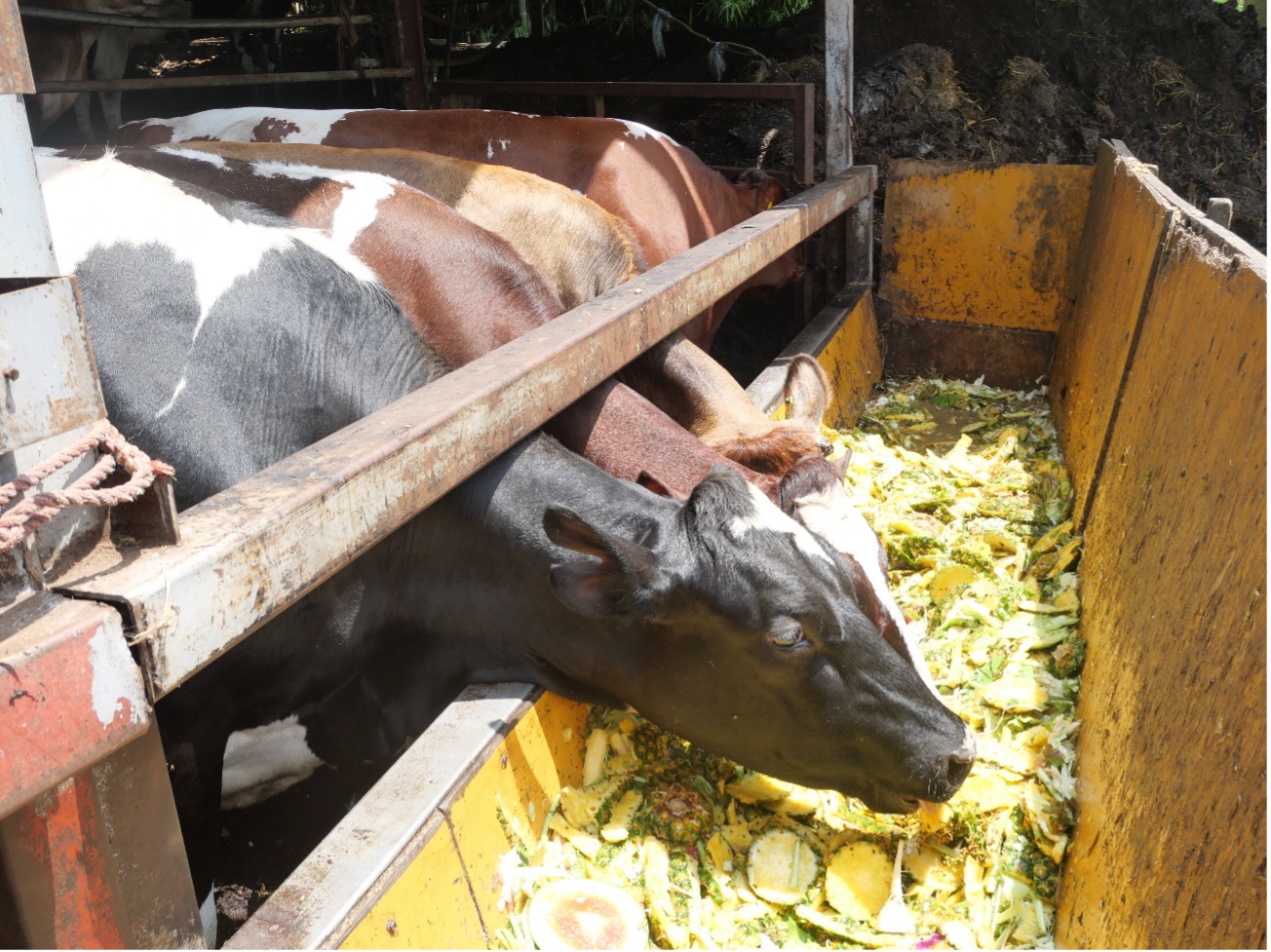 野菜加工場から出るパイナップルの皮を食べる牛たち