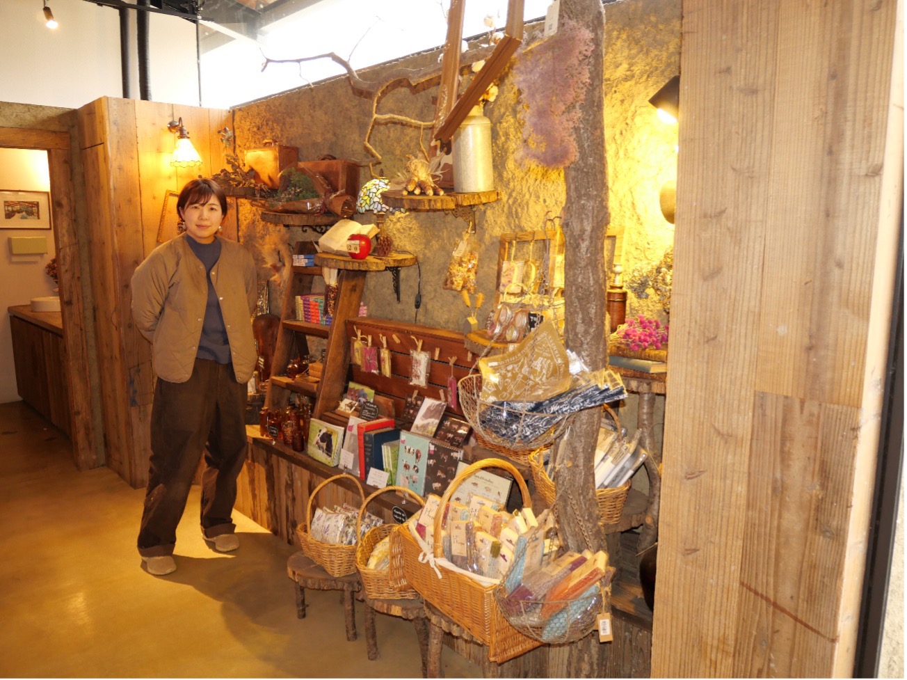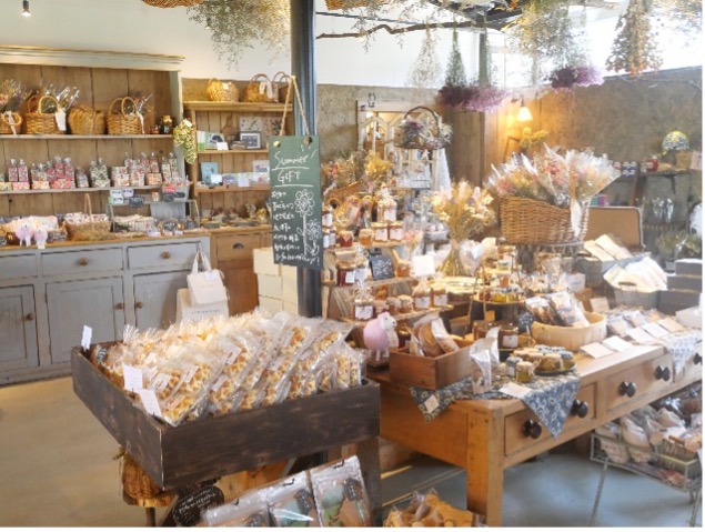 「牧場の遊休農地を生かして栽培した花はドライフラワーにしています。インテリアの家具類は、社長にディレクションしていただきました」と杏さん。