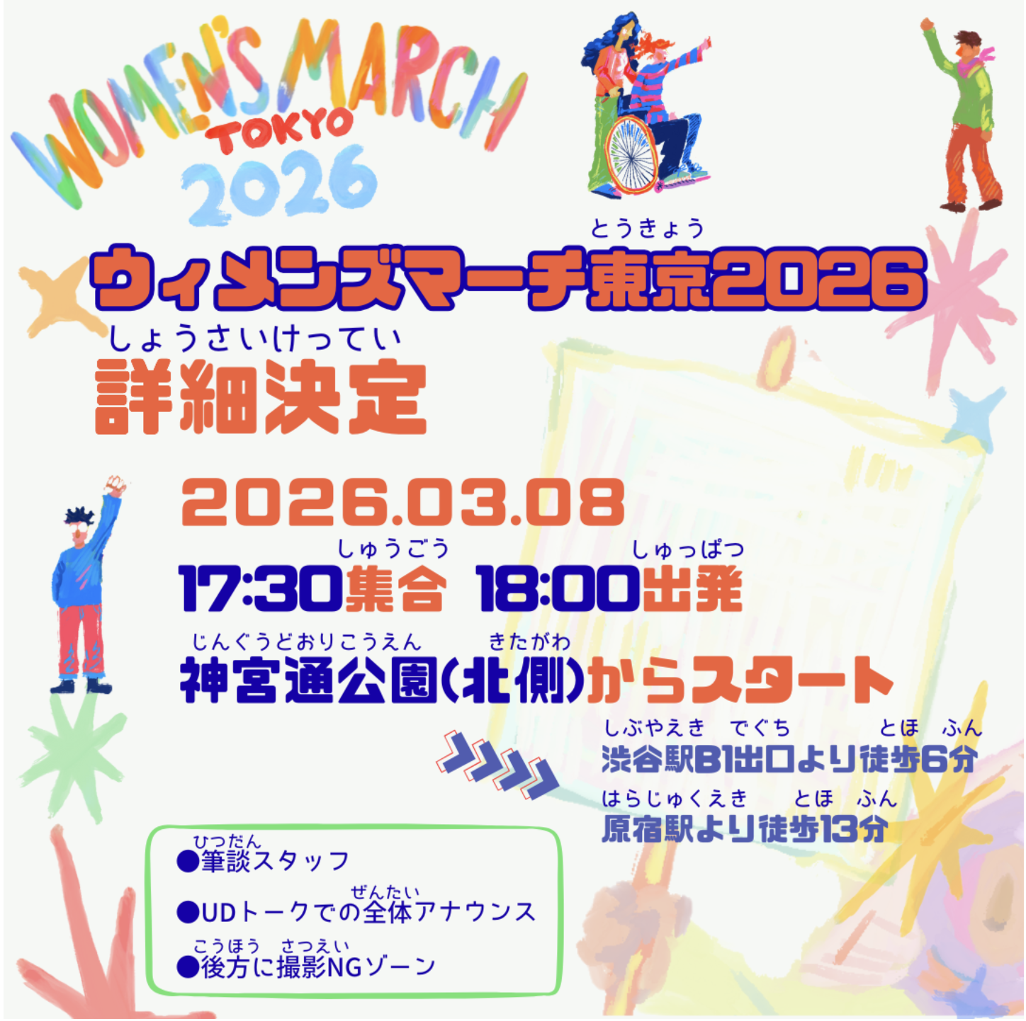 ※ウィメンズマーチ東京は、多様な参加者を歓迎します。すべての参加者が安心して歩けるよう、特定の個人やグループを差別・排除するような言動は認めません。このグランドルールを守っていただけない場合にはマーチに参加できません。