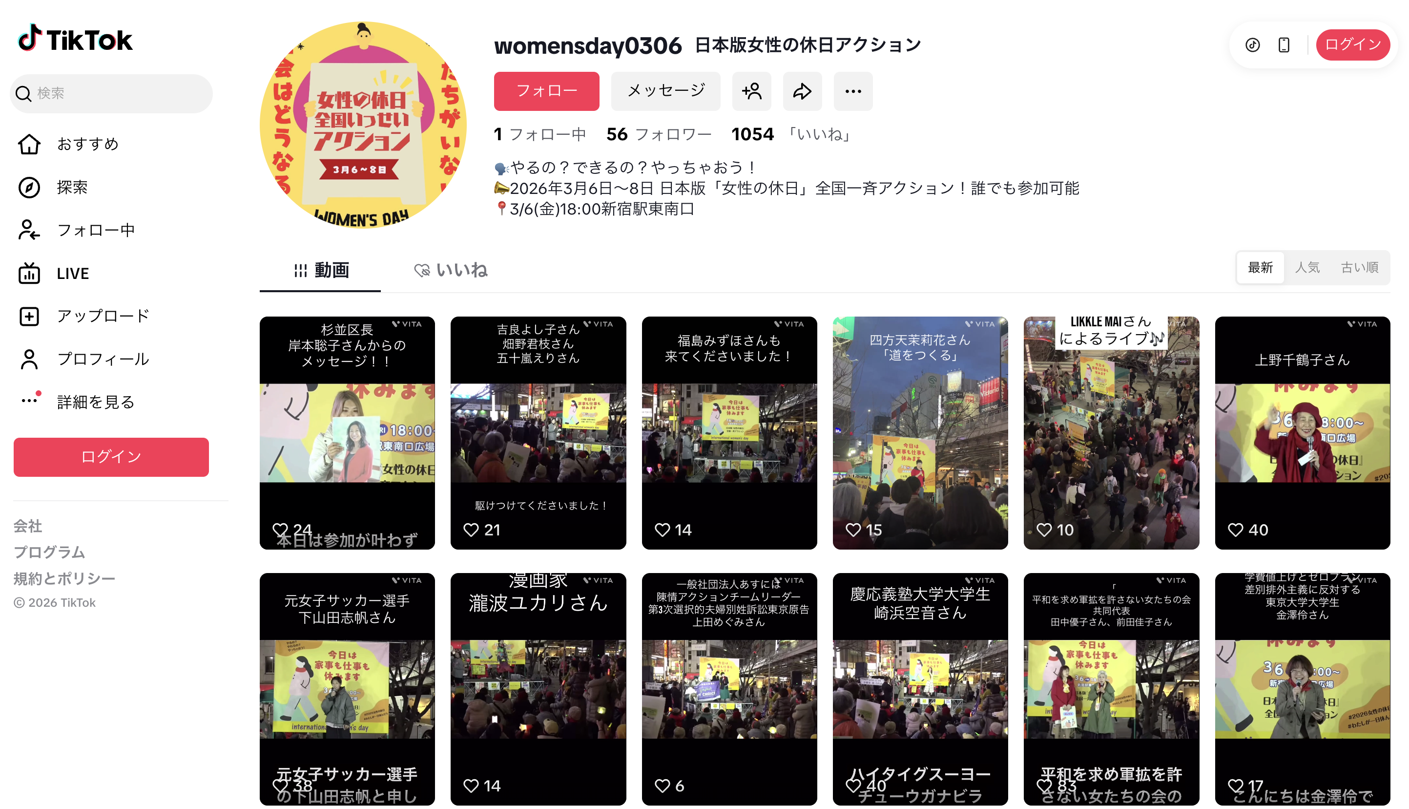 2026年3月6日「女性の休日アクション」新宿駅東南口開催にはおよそ600人が集いました。新聞記事によると、盛岡や茨城など遠方からの参加者も!