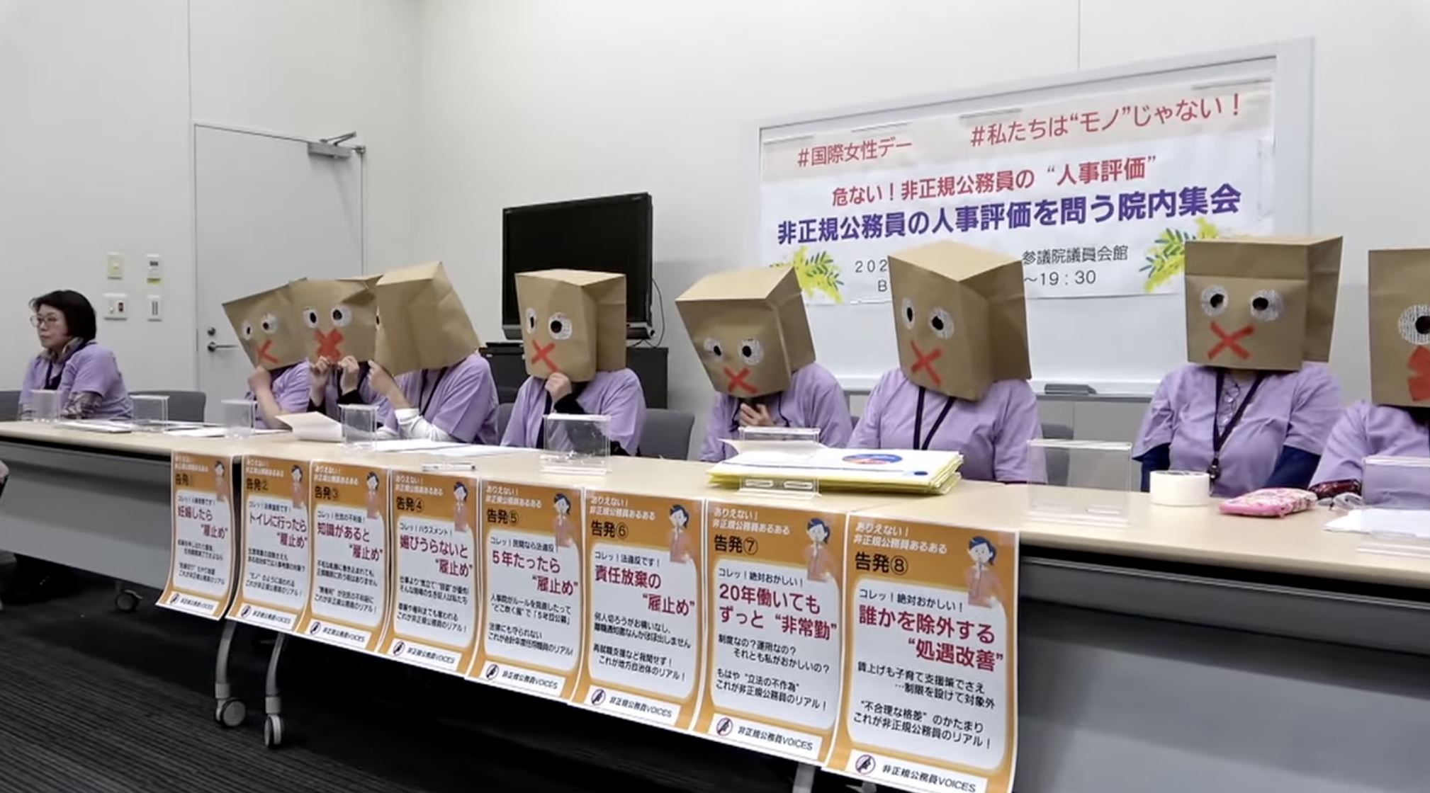 非正規公務員については「気楽で時給が高い」とされることも少なくありません。ただ、「1年だけの公務員」と法律に書かれ、仕事はずっとあるのに任用を打ち切ってはまた任用し直すという超不安定な働かせられ方の中で、異論があってもモノを言えず、今回は、「身バレ」を防いで安心して発言できるよう、苦肉の策として、覆面をかぶって訴えるという試みとなりました。そんな中で、トイレの回数が評価に影響するといった訴えまで集会直前に舞い込むなど、隠れた厳しい実態が改めて明るみに出ました。