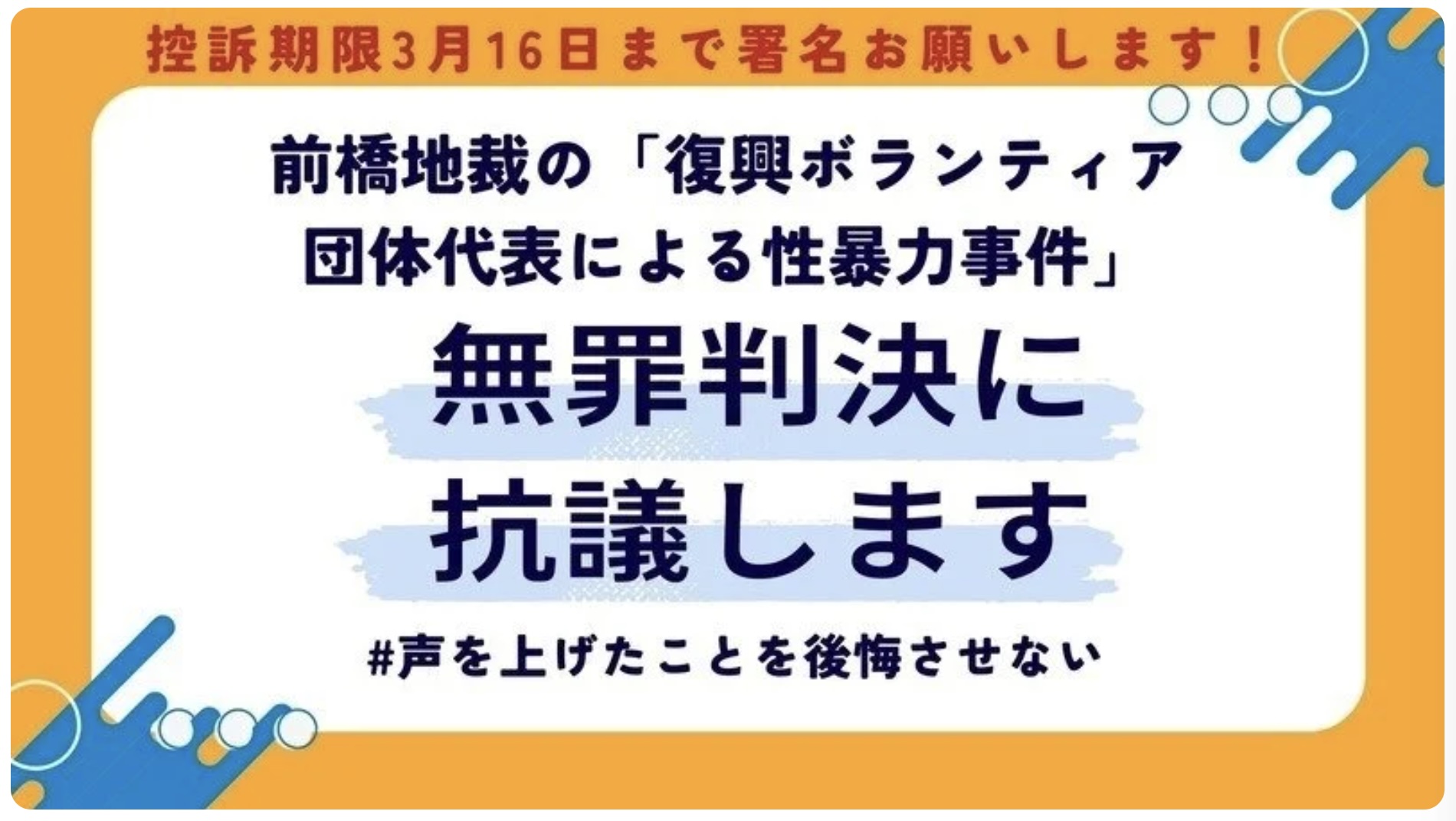 本署名は、「不同意性交」は「性暴行」である、という認識を広く共有するためにも、今回の「無罪判決」に抗議するとともに、高等裁判所での新たな審理を強く求めるものです。