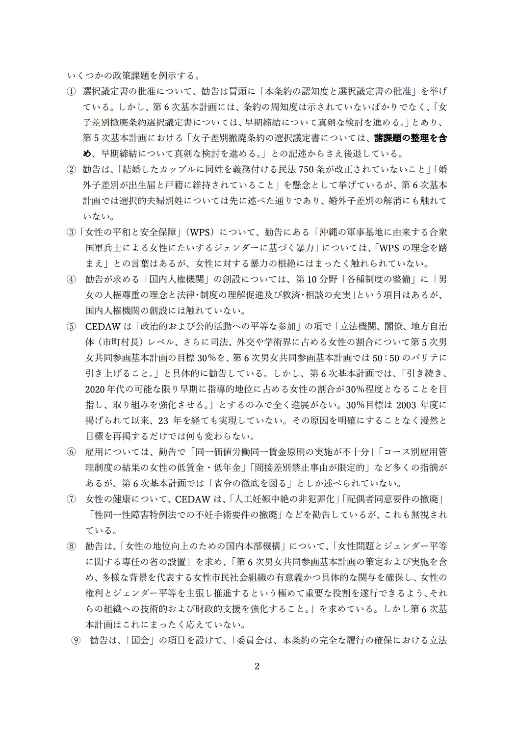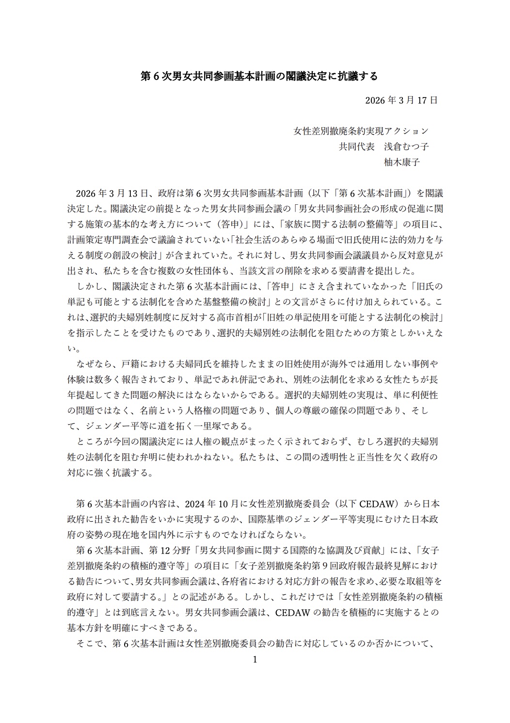 女性差別撤廃条約実現アクションが3月2日に発した声明『「第 6 次男女共同参画基本計画策定に当たっての基本的な考え方(答申案)」に