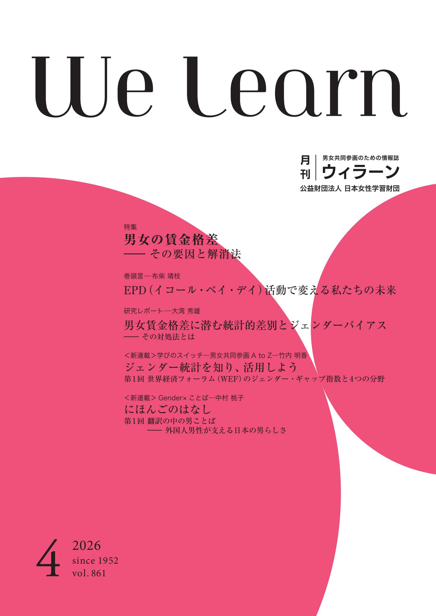 …………今号では「男女賃金格差」に光を当て、その要因や解消法を探りたいと執筆いただきました。日本では、男性が1年間で得られる賃金を女性が得るためには、4カ月も余分に働かなければならないという数字に落胆しつつ、「賃金格差は個人の責任ではなく社会課題」との金井郁さん(このひと)の言葉の通り、社会課題として今号をヒントに、皆さんとともに考えていきたいです。
