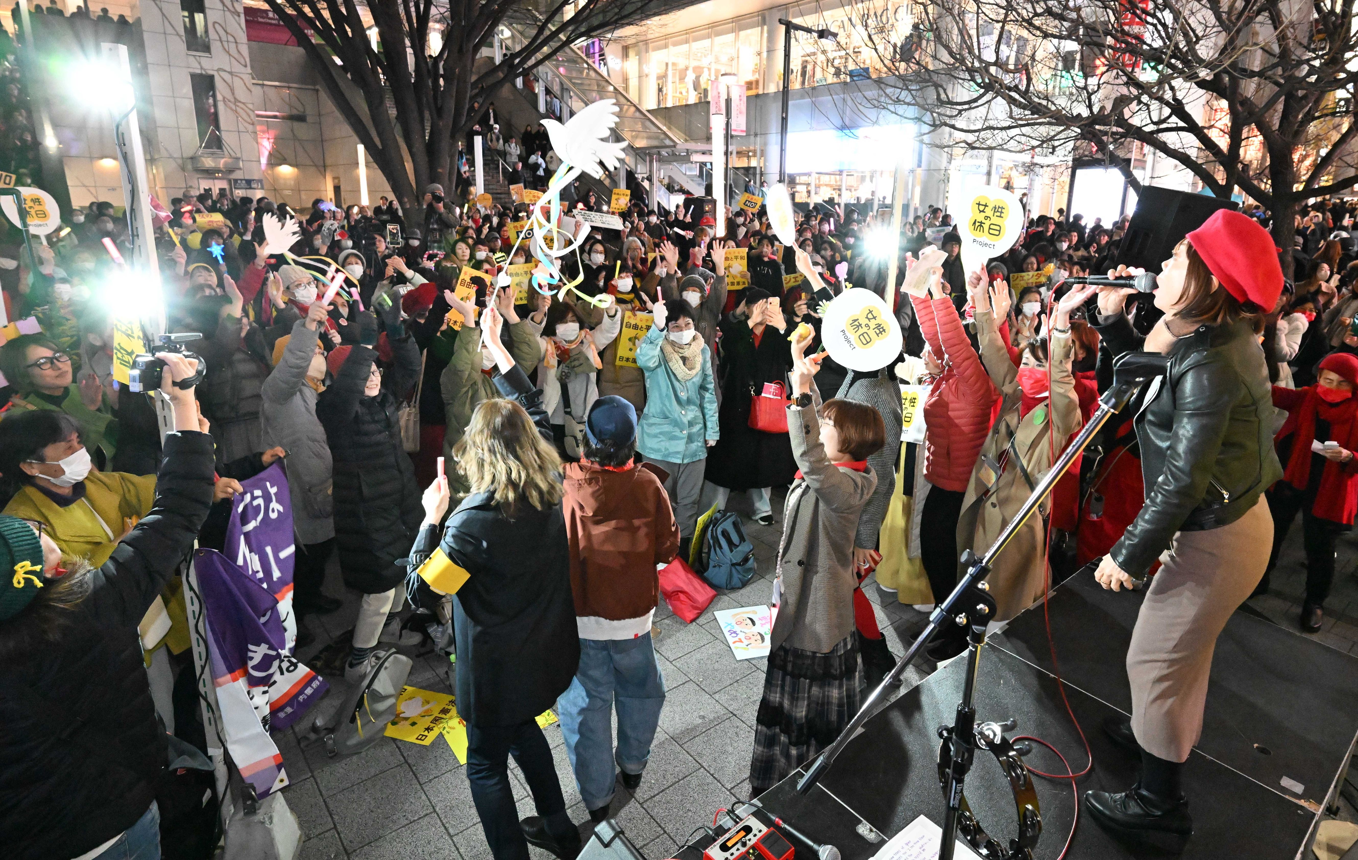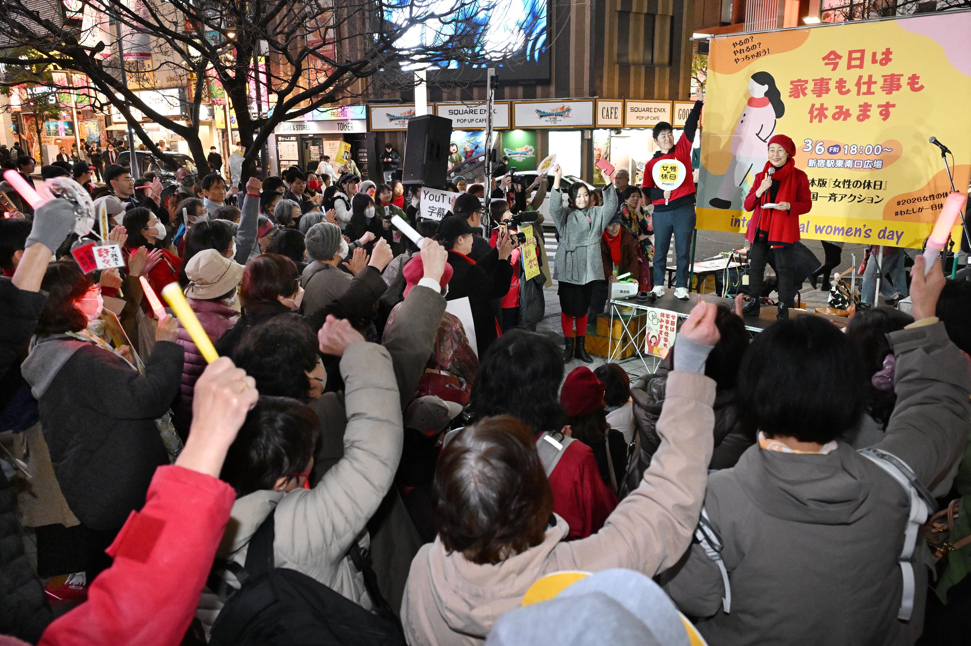 2026年3月6日金曜日夜、新宿駅東南口広場は、日本版「女性の休日」アクションに参加するために集った女性たちの熱気で溢れていた。