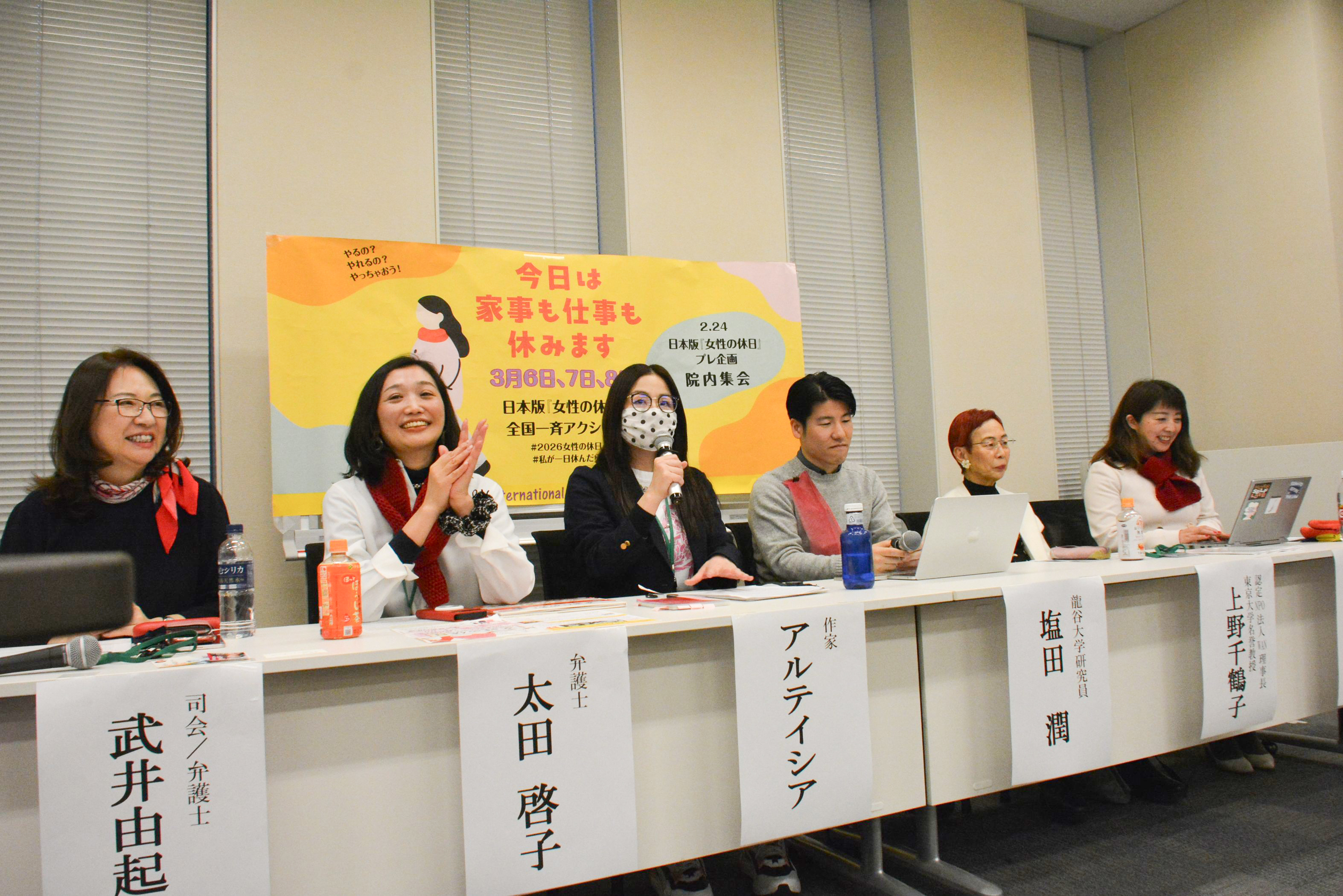 集会では、上野千鶴子さんが「日本社会とジェンダー 女性はなぜ活躍できないのか」をテーマに、日本がいかにジェンダー後進国であるかをデータに基づいて報告したほか、アルテイシアさんとアイスランド政治研究者で龍谷大学研究員の塩田潤さんが対談を行った。アルテイシアさんは、映画「女性の休日」に登場するアイスランドの女性たちと同様、日本の女性たちも「女性の休日」に参加するかどうか悩んでいると話して、ある女性のエピソードを紹介し、「家庭でも職場でも、普段女性がやっていることを男性がやってください。そして気持ちよく女性を送りだしてください」と呼びかけた。