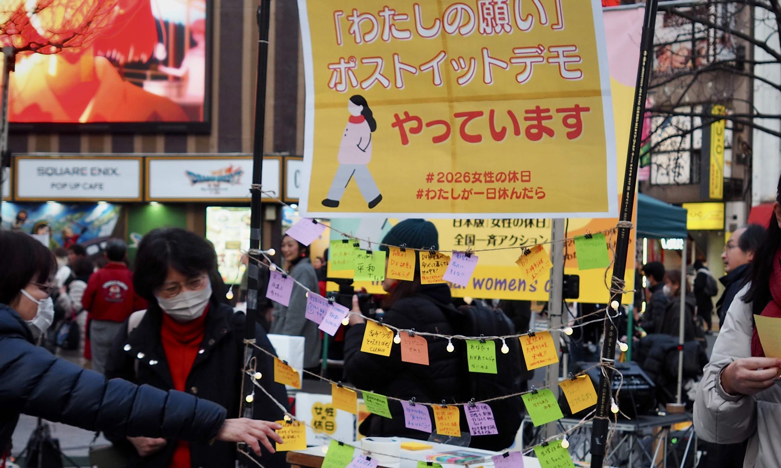3月6日の日本版「女性の休日」アクションは、新宿駅東南口広場に〝今日は家事も仕事も休みます〟と書いた大きなバックバナーを設置し、ステージを組んで行った。同広場で17時頃から始めたポストイットデモ(付箋に意見を書き込み掲示する)には、88名の方が参加した。最も多く書き込まれたテーマは選択的夫婦別姓で、〝選択的夫婦別姓実現して!旧姓使用法制化じゃダメ!〟〝アイデンティティの問題です!!〟などと書かれた付箋が並んだ。また男女賃金格差解消を求める声や、〝ケア労働の賃金をあげて長時間労働を改善して!〟〝つながっていこ!あきらめないでいこ!シスターフッド万才!!〟〝戦争ぜったい反対!!アメリカのような軍事大国になってほしくない!〟など、多様な声が色とりどりの付箋に書かれて掲示された。