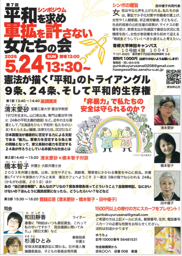 「日本国憲法が徹底的に否定する、力による支配である『暴力』。軍事力を否定する9条と車の両輪となって、家父長制の暴力を否定する24条が作ろうとしている非暴力な社会とは」(基調講演紹介より)―戦争が日常から遠いものではなくなっている今、憲法学者の清末愛砂さんの基調講演と、つづく橋本智子弁護士との対談を通じて、9条に限られない日本国憲法の平和主義の意義を考えます。皆さまのご参加を心よりお待ちしています!