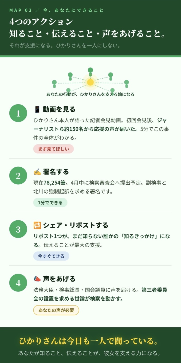 女性検事を支援する会事務局は、被害を告発した女性検事(ひかりさん)に寄り添うとともに、検察庁、法務省、裁判所がそれぞれの役割を果たすことに繋げたいと思い、署名を立ち上げ、参加を呼びかけています。