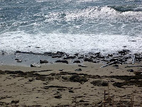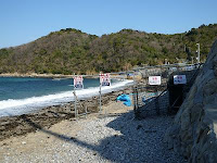 Pillars and stakes are remains from the net and ropes erected by Chuden to stop the protesters from coming down the slope to the beach, and the oil fence was an underwater curtain which Chuden tried to install in the bay to stop the people from Iwaishima to land on Tanoura Beach by boats.
