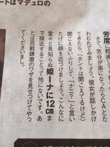 “Once you get settled on the plane, try teasing a cabin attendant. When she talks to you, pretend you can’t hear her (actually you do hear her) and lean toward her as if you were asking what she just said. There is no other chance for you to get close in a 12-cm distance to a himena(Note: term coined by the writer to denote a lady) whom you’ve never met in such an open manner. Now, all you have to do is demonstrate your hard-earned skills.” (the bold text is as it is in the original)
