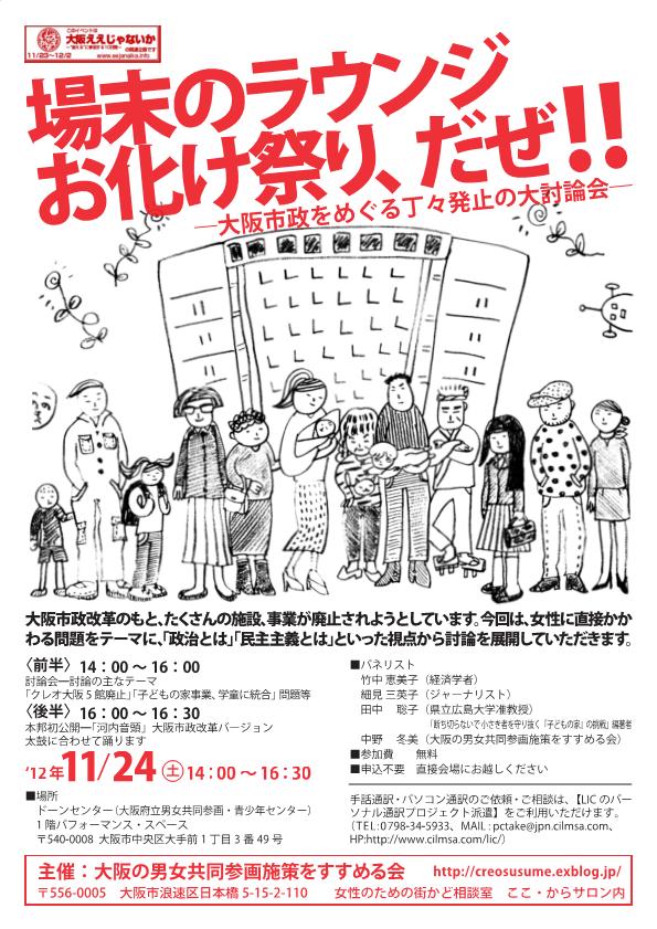 | 詳細: | タイトル:場末のラウンジお化け祭り、だぜ!! ―大阪市政をめぐる丁々発止の大討論会― 内容:今回は、女性に直接かかわる問題をテーマに、「政治とは」「民主主義とは」といった視点から討論を展開します。 一言言いたい方、ぜひお越しください。 *2012年11月24日(土)2:00~4:30 *ドーンセンター(大阪府立男女共同参画・青少年センター)1階パフォーマンス・スペース ●前半 2:00~4:00 討論会 ・討論の主なテーマ 「クレオ大阪5館廃止」「子どもの家事業、学童に統合」「リバティ(実質的には)廃止」問題、そのほか大阪市政に関して。 《パネリスト》竹中恵美子さん(経済学者) 細見三英子さん(ジャーナリスト) 田中聡子さん(広島県立大学准教授) 中野冬美さん(大阪の男女共同参画施策をすすめる会) ●後半 4:00~4:30 河内音頭(大阪市政改革バージョン)を太鼓に合わせて踊りましょう。本邦初公開です。 ■参加費:無料 ■申込不要 直接会場にお越しください。 ■「手話通訳・パソコン通訳のご依頼・ご相談は、【LICのパーソナル通訳プロジェクト派遣】をご利用いただけます。 (TEL:0798-34-5933、MAIL:pctake@jpn.cilmsa.com、 ) HP: http://www.cilmsa.com/lic/ ********** 大阪の男女共同参画施策をすすめる会 http://creosusume.exblog.jp/ |