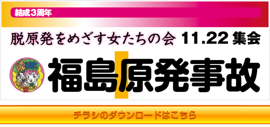 | 詳細: | 脱原発をめざす女たちの会は11月22日に集会を開きます。 タイトルは「福島原発事故 4年目の真実」です。 今年の猛暑も原発ゼロで電気は足りていました。 それなのになぜ原発を再稼働し、原発を海外に売りまくるのでしょうか? 原子力産業に群がる人々の私益のため、そしてプルトニウムを溜めこんで核武装できる日本にするためでしょうか? 汚染水によって放射能被害は世界に広がり、被曝の影響が日本のあちこちに表れています。 原発事故がもたらした現実をもう一度見つめなおし、脱原発への道を探りましょう。 脱原発をめざす女たちの会 11.22集会 「福島原発事故 4年目の真実」 日時 2014年11月22日(土) 開場13:30 開会14:00~16:30 会場 星陵会館(地下鉄有楽町線・半蔵門線・南北線 永田町駅6番出口、 地下鉄千代田線 国会議事堂前駅5番出口、南北線 溜池山王5番出口) 参加費 1000円 プログラム ★海外メディアが伝える私たちの知らないフクシマ 仏独共同国営放送局ARTE「フクシマ最悪の事故に潜む真実」などから ★講演 「拡散する放射能と福島第一原発のいま」澤井正子さん(原子力資料情報室) 「脱原発を結んで~フクシマ事故被害者の健康と生活を守ろう」 振津かつみさん(医師/チェルノブイリ・ヒバクシャ救援関西) 「放射能時代を生きる3つのアクション」辛淑玉さん(人材育成技術研究所所長) ★スピーチ 「被ばく者としてー今も福島で」古川好子さん(避難を考える会/会津若松市在住) お申し込みは会のホームページ「参加お申し込みはこちらから」よりお願いします。 http://www.nnpfem.com/ 当日参加も受け付けますが、お申込み多数の場合は入場できないこともあります。 事前のお申し込みをお待ちしています。 |