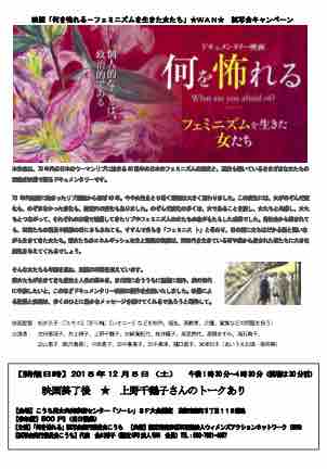 | 詳細: | WAN試写会キャンペーンの一環として「何を怖れるーフェミニズムを生きた女たち」を高知で開催します。当日は、映画終了後に映画に出演している上野千鶴子さんと四万十市在住の滝石典子さんにそれぞれ15~20分お話していただき、また、会場の皆様との交流をしていただきます。 |