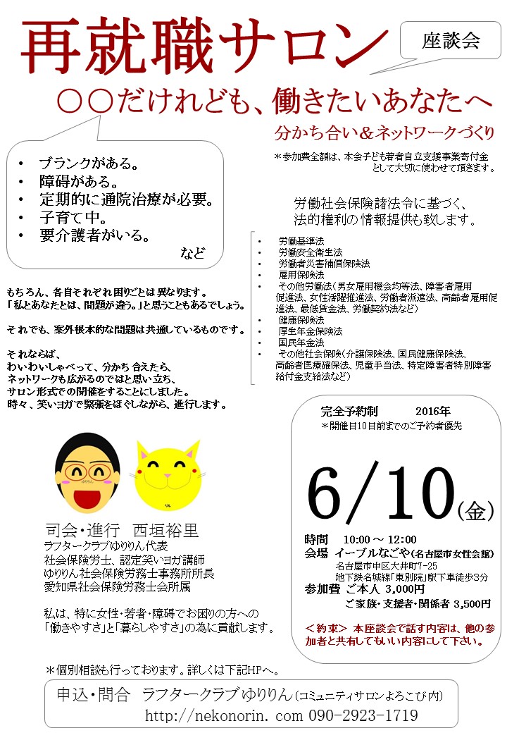 | 詳細: | 詳細・申込は、主催者HP本イベントページをご確認下さい。 *参加費全額は、本会子ども若者自立支援事業寄付金として大切に使わせて頂きます。 完全予約制 開催日10日までのご予約者優先。 参加費 ご本人 3,000円、ご家族・支援者・関係者 3,500円 約束 本座談会で話す内容は、他の参加者と共有してもいい内容にして下さい。 司会・進行 西垣裕里(社会保険労務士、認定笑いヨガ講師、精神保健福祉士) ブランクがある 障碍がある 定期的に通院治療が必要 子育て中 要介護者がいる などなどのあなたへ 分かち合い&ネットワークづくりを行っています。 もちろん、各自それぞれ困りごとは異なります。 「私とあなたとは、問題が違う。」と思うこともあるでしょう。 それでも、案外根本的な問題は共通しているものです。 それならば、 わいわいしゃべって、分かち合えたら、 ネットワークも広がるのではと思い立ち、 サロン形式での開催をすることにしました。 時々、笑いヨガで緊張をほぐしながら、進行します。 労働社会保険諸法令に基づく、 法的権利の情報提供も致します。 |