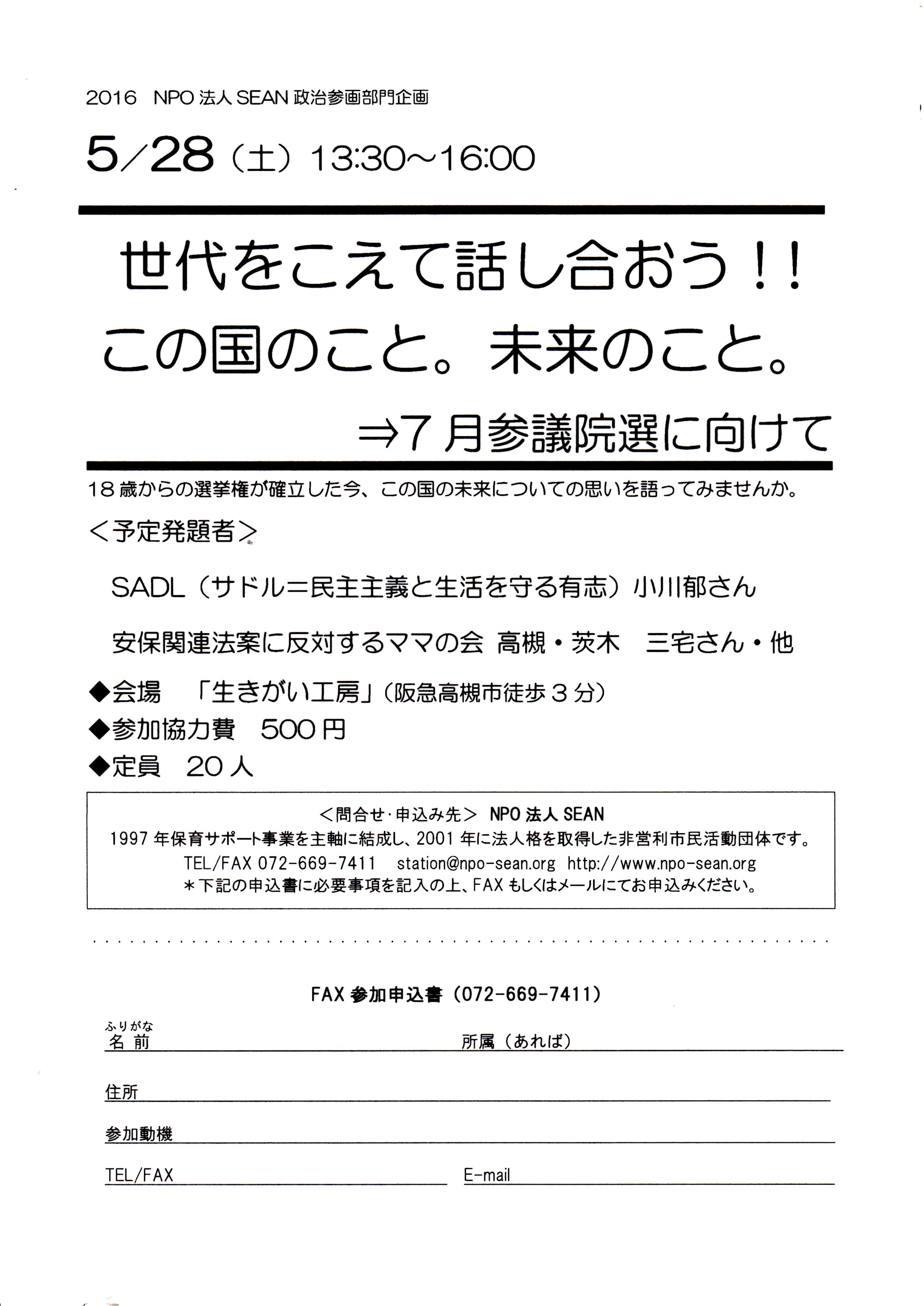 | 詳細: | 5月28日(土)13:30~16:00 世代をこえて話し合おう!!この国のこと。未来のこと。 ⇒7月参議院選に向けて 18歳からの選挙権が確立した今、この国の未来についての思いを語ってみませんか。 <予定発題者> SADL(サドル=民主主義と生活を守る有志)小川郁さん 安保関連法案に反対するママの会 高槻・茨木 三宅さん・他 参加協力費 500円 定員 20人 会場 「生きがい工房」(阪急高槻市徒歩3分) |