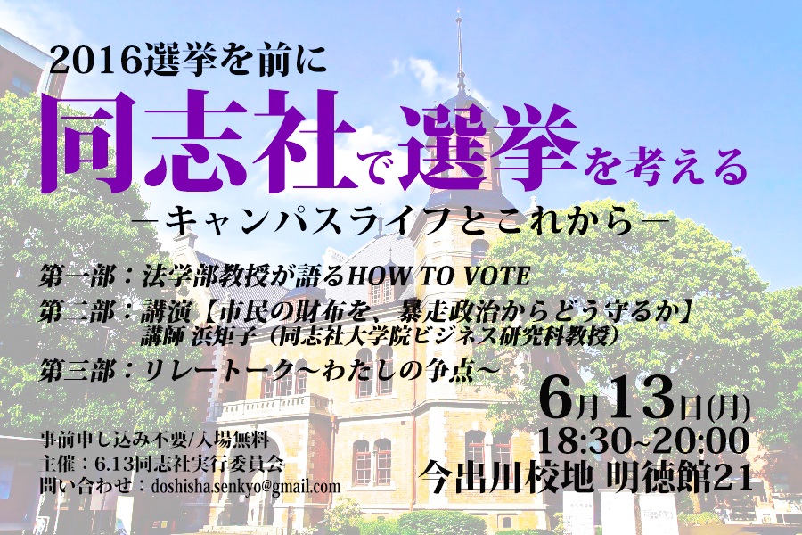 | 詳細: | 1.法学部教授が語るhow to vote 2.「市民の財布を、暴走政治からどう守るか」浜矩子先生講演 3. リレー・トーク わたしの争点 予約不要/ 入場無料 |