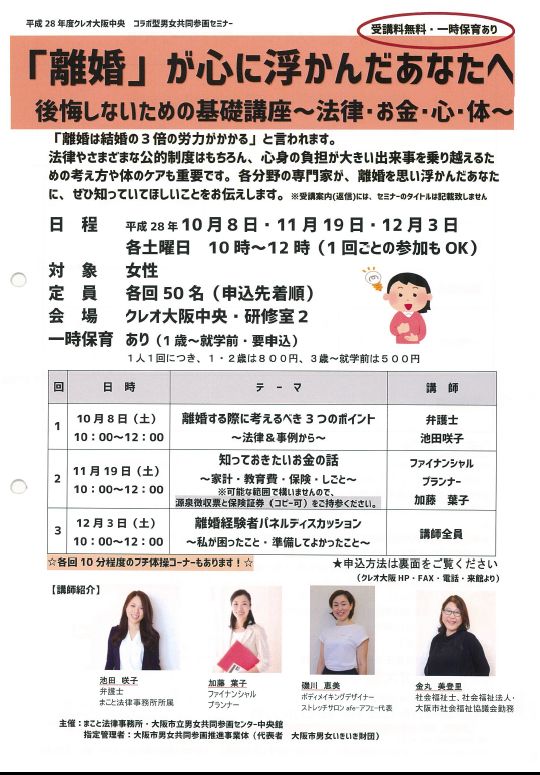 | 詳細: | 「離婚は結婚の3倍の労力がかかる」と言われます。 法律やさまざまな公的制度はもちろん、心身の負担が大きい出来事を乗り越えるための考え方や体のケアも重要です。 各分野の専門家が、離婚を思い浮かんだあなたに、ぜひ知ってほしいことをお伝えします。 ※受講案内(返信)には、セミナーのタイトルは記載致しません 日程:平成28年10月8日・11月19日・12月3日 各土曜日 10時~12時(1回ごとの参加もOK) 対象:女性 定員:各回50名(申込先着順) 一時保育あり(1歳~就学前・要申込) 1人1回につき、1歳~2歳は800円、3歳~就学前は500円 テーマ 1回目 10月 8日 離婚する際に考えるべき3つのポイント~法律&事例~ 講師(弁護士 池田咲子) 2回目 11月19日 知っておきたいお金の話~家計・教育費・保険・しごと~ 講師(ファイナンシャルプランナー 加藤葉子) ※可能な範囲で構いませんので、源泉徴収票と保険証券(コピー可)をご持参ください。 3回目 12月 3日 離婚経験者パネルディスカッション ~私が困ったこと・準備してよかったこと~ 講師(全員) 申込・問合せ クレオ大阪中央 TEL:06-6770-7200 fax:06-6770-7705 |