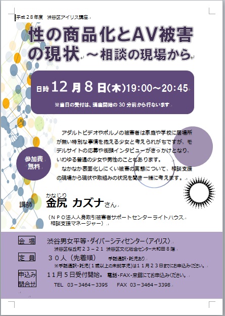 | 詳細: | アダルトビデオやポルノの被害者は家庭や学校に居場所が無い特別な事情を抱える少女と考えられがちですが、 モデルサイトの応募や街頭インタビューがきっかけとなり、いわゆる普通の少女や男性のこともあります。 なかなか表面化しにくい被害の実態について、相談支援の現場から現状や取組みの状況を聞き一緒に考えます。 日時:12月8日(木)19:00-20:45(開場18:30) 講師:金尻 カズナさん (特定非営利活動法人 人身取引被害者サポートセンターライトハウス相談支援マネージャー) 会場:渋谷男女平等・ダイバーシティセンター〈アイリス〉 渋谷区桜丘町23-21 渋谷区文化総合センター大和田8階 定員:30人〈先着順〉 手話通訳・託児(1歳以上の未就学児)あり、12月1日までにお申込みください。 申込:電話・FAX・来館にてお申込ください。 |