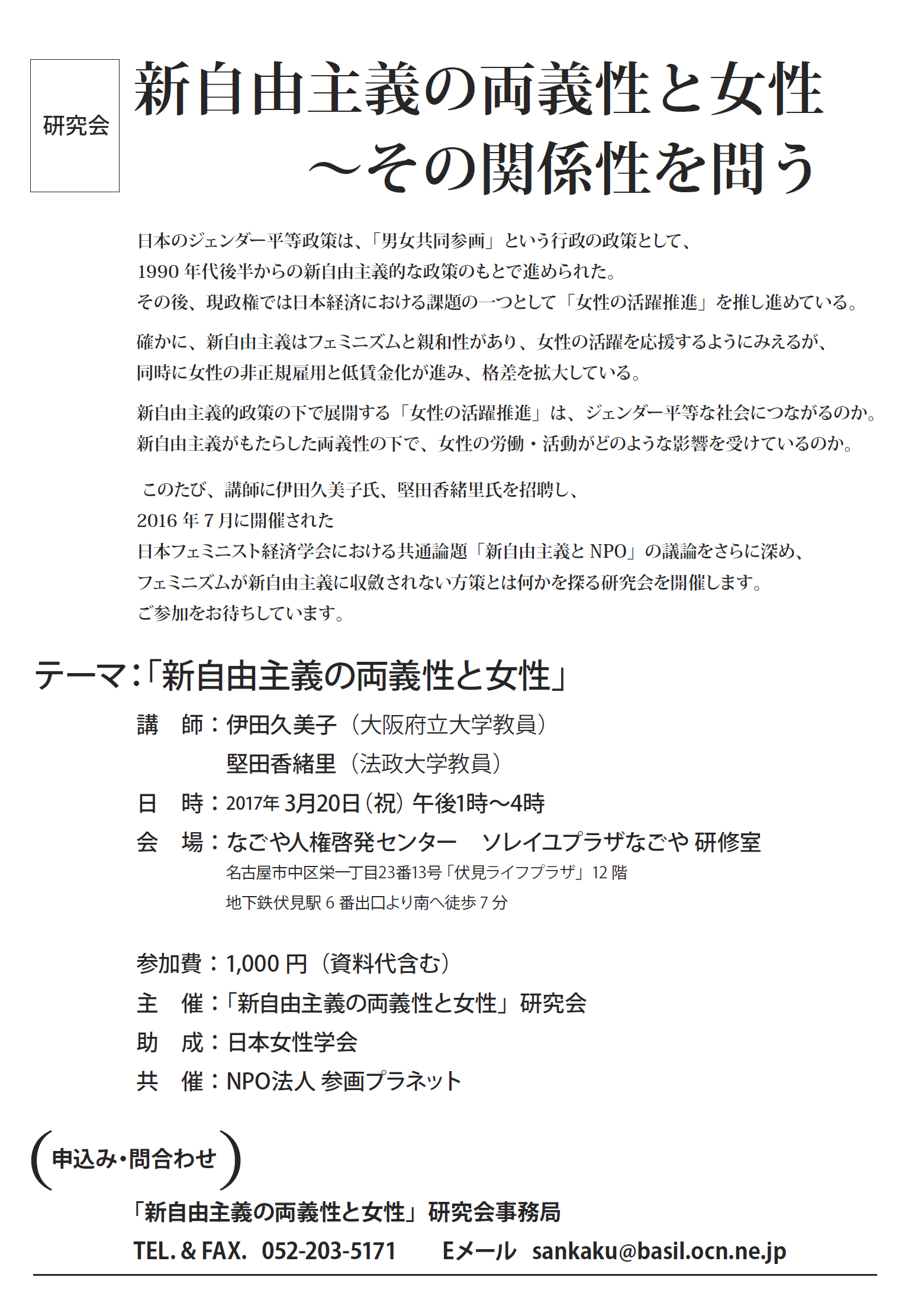 | 連絡先: | 「新自由主義の両義性と女性」研究会 事務局 |