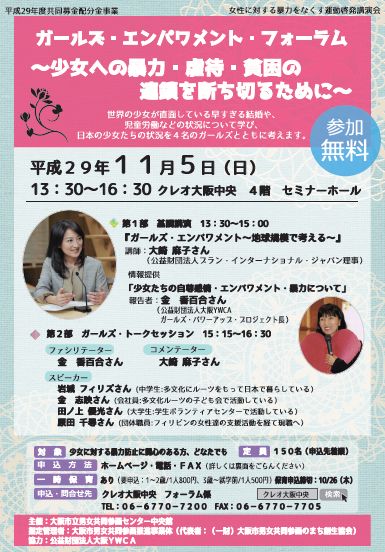 | 詳細: | 世界の少女が直面している早すぎる結婚や、児童労働などの状況について学び、日本の少女たちの状況を4名のガールズとともに考えます。 (平成29年度共同募金配分金実施事業) 第1部 基調講演(13:30~15:00) 『ガールズ・エンパワメント~地球規模で考える~』 講師:大崎 麻子さん(公益財団法人プラン・インターナショナル・ジャパン理事) 情報提供 『少女たちの自尊感情・エンパワメント・暴力について』 報告者:金 香百合さん(公益財団法人大阪YWCAガールズ・パワーアップ・プロジェクト長) 第2部 ガールズ・トークセッション(15:15~16:30) コメンテーター:大崎 麻子さん ファシリテーター:金 香百合さん スピーカー:岩城 フィリズさん、金 志映さん、田ノ上 優光さん、原田 千尋さん 日時:平成29年11月5日(日) 13:30~16:30 会場:クレオ大阪中央 4階 セミナーホール 参加費:無料 対象:少女に対する暴力防止に関心のある方、どなたでも 定員:150名(申込先着順) 一時保育:あり(1歳~就学前) 1歳~2歳800円 3歳~就学前まで500円 保育申込み締切:10月26日(木) 主催:大阪市立男女共同参画センター中央館 協力:公益財団法人大阪YWCA |