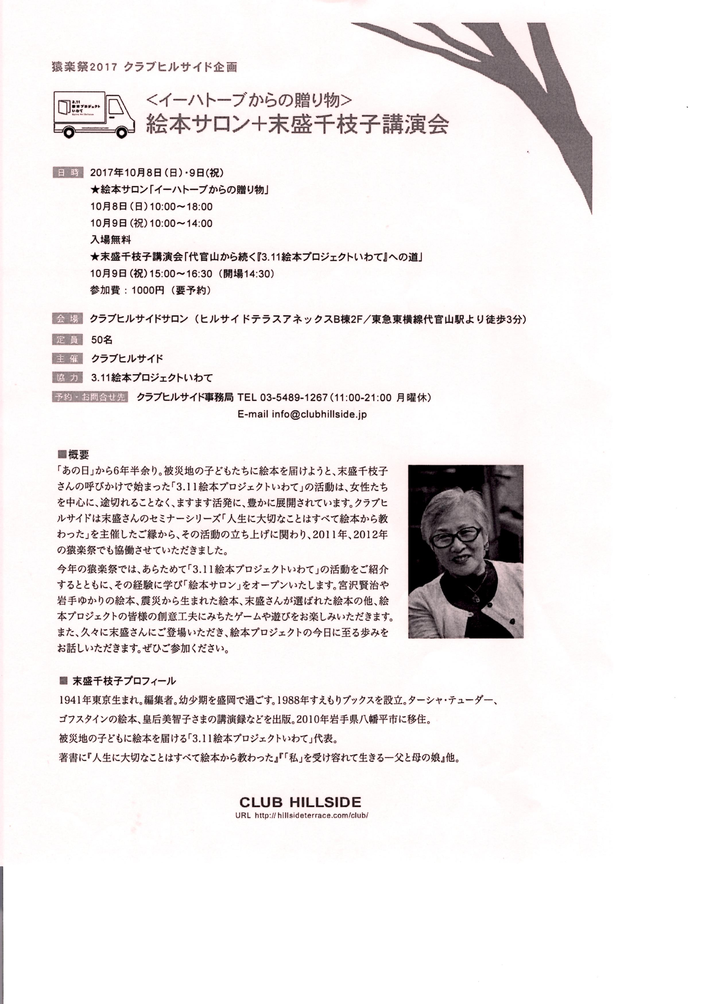 猿楽祭2017クラブヒルサイド企画<イーハトーブからの贈り物>絵本サロン+末盛千枝子講演会